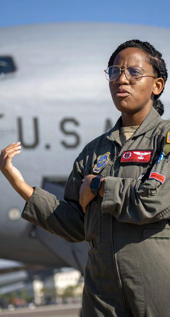 U.S.AirForceCapt.OrchydiaSackey,aKC-135Stratotankerpilotassignedthe50thAirRefuelingSquadron, explainsaerial refuelingprocedurestomembersofthe Womenin Aviation TampaBayChapterduringatour atMacDillAirForceBase,Florida,Feb.23,2023.The tourgaveexperiencedandaspiringaviatorsthechance tomeetwithservicemembersandgainabetter understandingoftheAirForcemission.