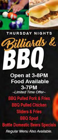 MACDILL THUNDERBOLT u Thursday, March 28, 2024 u WWW.MACDILLTHUNDERBOLT.COM u 3 April‘24 6FSSNEWS 3 BounceBack Menu Featuring... Salads, Wings, Nachos & MORE! OPEN THU & FRI 3-8PM Food | Full Bar | Pool Tables TVs | Thursday Billiards & BBQ | Friday Stampede inside Breakaway EventCenter B LET US COOK DINNER! Call in Order To-Go Food Served 3-7PM ESM Welcome! MENU FEATURING... Nachos, Salads, Beach Time Favorites, Baskets, Sandwiches & MORE! TUE-THU 11AM-9PM • FRI 11AM-10PM • SAT 3PM-10PM FOOD SERVED: TUE-FRI 11AM-8PM • SAT 3PM-8PM BAR: OPENS AT 3PM For Inquiries Regarding Special Events at SeaScapes Phone: (813) 840-2020 6FSS.2.brewscatering@us.af.mil CHECK OUTTHE MENU! OPEN FOR LUNCH& DINNER! BENTO BOXES GRAB & GO! POWER EATS SHORT FITNESS CENTER Weekend Dining “Just for Kids” Exclusive to All Children (12 & Under) 8 IRON GOLF Mini Golfer • $6.50 (6:30-10:30am) One Large Fluffy Pancake with Choice of Topping & Whipped Topping (Blueberries, Banana, Chocolate Chips or Sprinkles), Side of Meat (Baconor Sausage), and Small Fountain Drink • $6.50 HANGAR6 Little Striker • $6.50 (Lunch /Dinner 11-8pm) 3 Piece Chicken Tenders, Curley Fries, Mini Fruit Cup, and Small Fountain Drink OPEN THU & FRI 3-8PM FA MI LY FI RS T SP EC IA LS NEW!