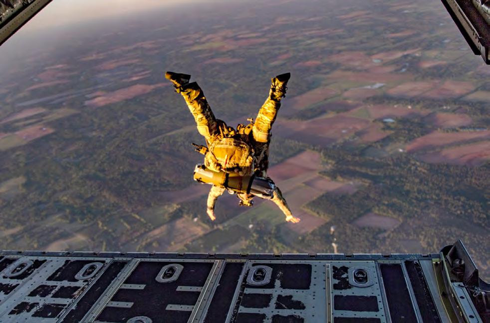 A U.S.AirForceAirmanassignedtothe38thRescueSquadronperformsamilitaryfreefalljump fromanHC-130JCombatKingIIduringExerciseReadyTiger24-1,April12.Theexercisesimulatedadownedpilotscenariowhichtestedthecombatsearchand rescueteam’sabilityto respondatamoment’s notice.