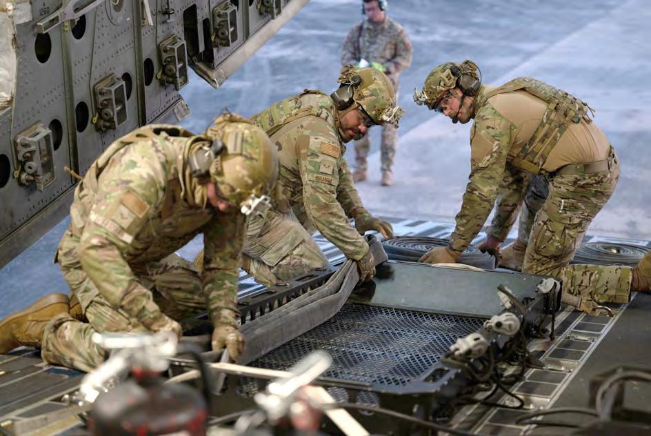 (Farleft)ParticipantsoftheForwardAreaRefueling PointRodeopackupafuelhoseatNorthAuxiliary Field,SouthCarolina,April4. FARPinvolvesdirect refuelingfromaC-17GlobemasterIIItoa receiver aircraftallowingforsmallfootprintoperationsinaustereenvironments,enablingairpowerprojectionanywhereintheworld.
