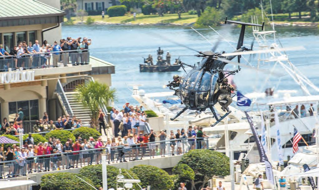 U.S.SpecialOperationsForcesmembersflyover TampaBayinaU.S.ArmyMH-6helicopterduring aSOFcapabilitiesdemonstrationMay18in Tampa.SOF WeekisthepremiergatheringfortheSOF communityandindustry,bringingtogethermorethan11,000attendees,including representatives frommorethan100countriestocollaborateonnewinitiativesandcapabilitiesneededforSOFprofessionalstocompeteandwininthefuture.