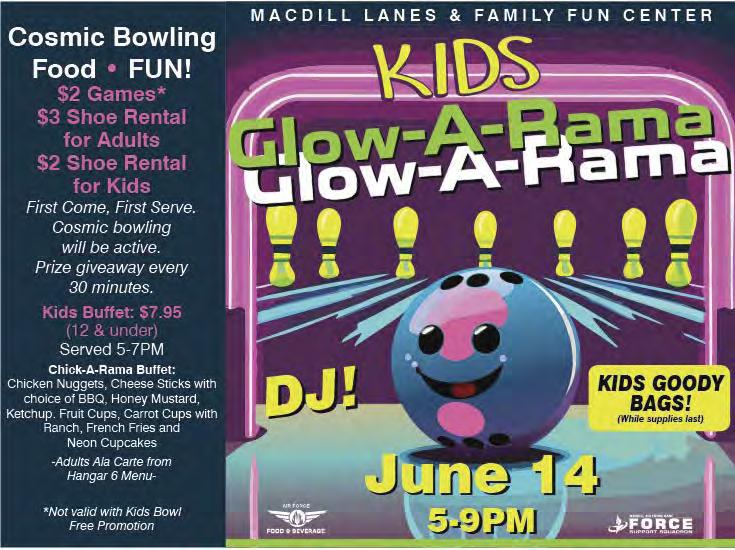 MacDillLaneshaspartneredwith Kids Bowl Free, aprogramdesignatedtogivebacktothecommunityand provideasafe, secure, andfun way forkidstospendtimethisspringand summer. Registeryour child(ren)to receive twofree gamesofbowling at theMacDillLanesMay25–Aug. 11. Formoreinfoandregistration, visit kidsbowlfree.com/center.php?alley_ id=6553.