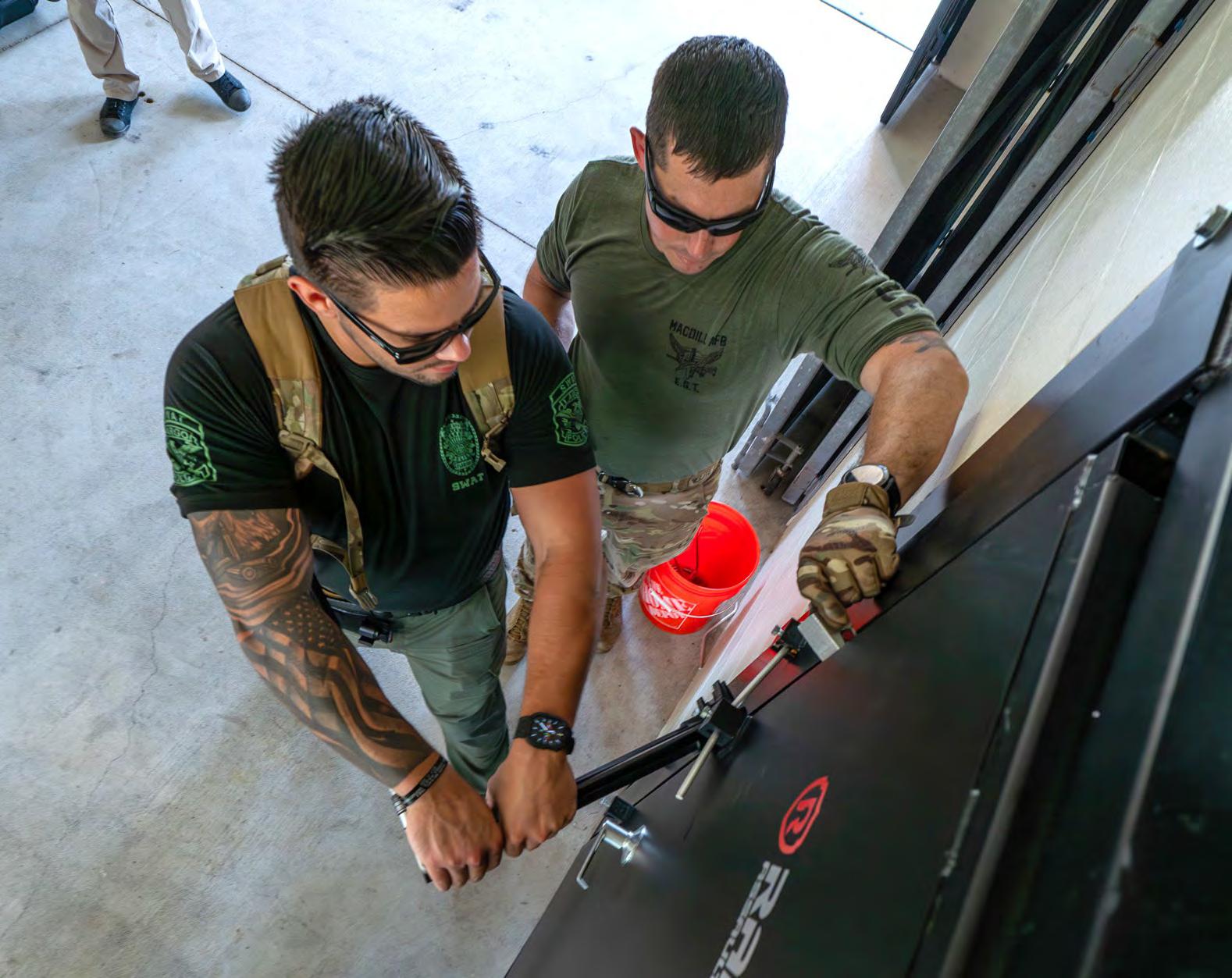 Tyler Sinni,aLargopoliceofficer,left,andU.S.AirForce MasterSgt.SeanPhelan,a6thSecurityForcesflightchief, attempttoopenaSensitiveCompartmentedInformationFacilitydooratabreachingsymposiumatMacDillAirForce BaseMay16.The6thSFSpartneredwithAFWERXandabreachingequipmentcompanytodevelopahydraulic breachingbackpackdesignedtoopenSCIFdoorswhichwerepreviouslyconsideredimpenetrable.Thefive-yearlongprojectwas unveiledtoseverallawenforcementagenciesrangingfromtheFederal BureauofInvestigationto localpolicedepartments.