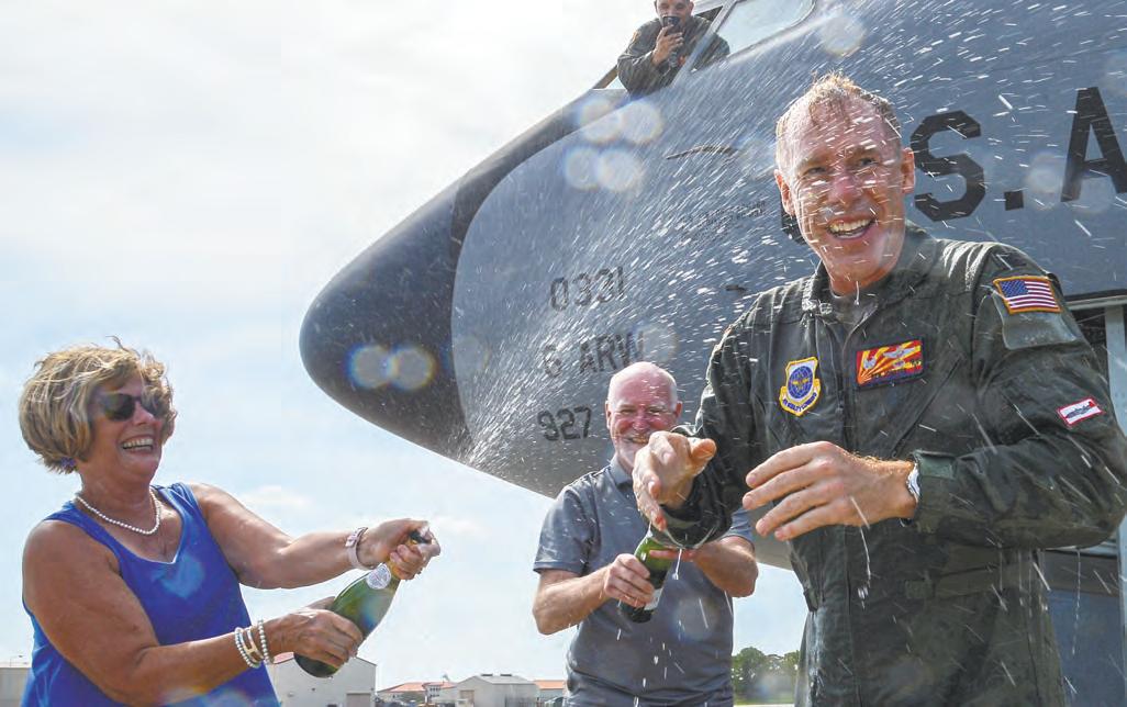 U.S.AirForceCol.BenjaminJonsson,6thAirRefuelingWingcommander,getssprayedwithchampagnebyhisfamilymembersafterhisfinalflightJune14atMacDillAirForceBase.Afinalflight,also knownasafiniflight,isatraditionforpilotswhoare retiringormovingtoanotherbase.ColJonsson completedhisfinalflightascommanderofthe6thARW, loggingover3700flighthoursinaKC-135 Stratotanker.