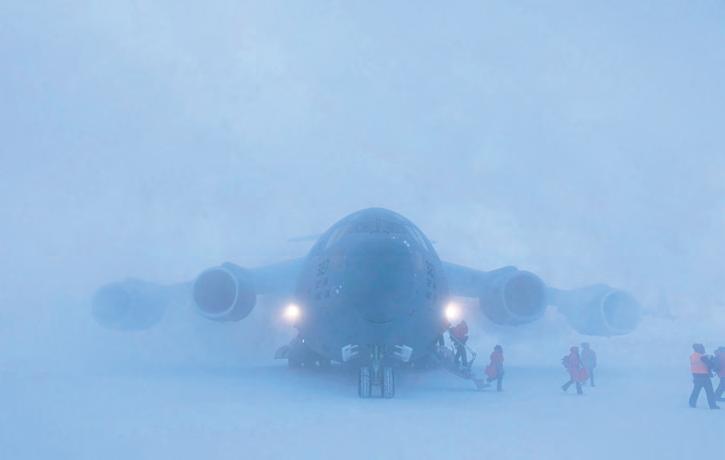 PassengersexitanAirForceC-17GlobemasterIIIaircraftatMcMurdo StationinAntarctica,Sept. 14,2020. Theaircraftanditscrewferried passengersandcargobetweenNewZealandandAntarcticainsupport ofthe2020-21OperationDeepFreezemission.