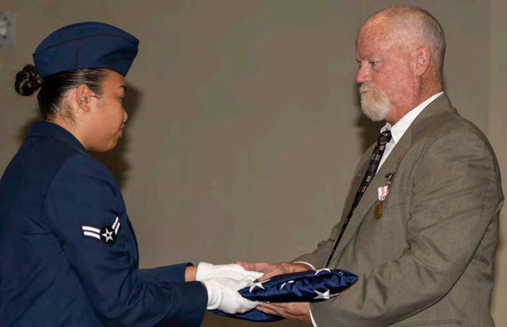 U.S. AirForceA1CRinoaCornel,base honorguardsman,presentsthe UnitedStatesflagtoSpecialAgentTimothyRies, duringhis retirement ceremonyatMacDillAirForceBaseJuly27.After retiringfromactive dutyin2000withtherankoflieutenantcolonel, Rieswentontoserve anadditional 23 yearsasacivilianspecialagentwith the Department of theAirForceOffice ofSpecialInvestigations.