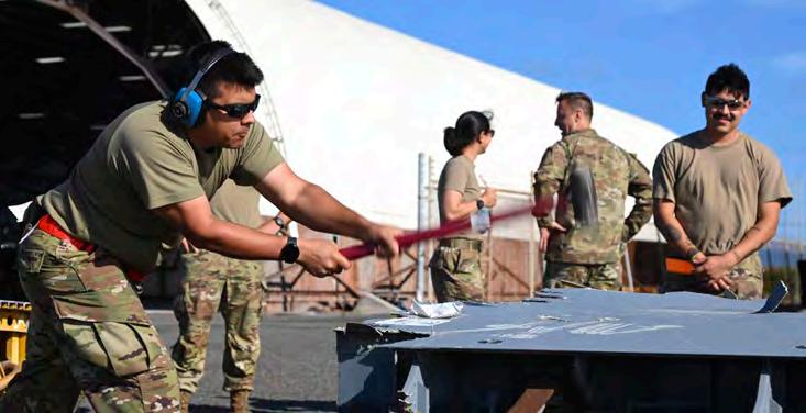 AFSCalsodeployedtwoAircraftBattleDamageRepairteamstoMG23.Thesespecial-duty, multi-qualified enlistedtechniciansbringthecapabilitytoperformdepot-levelrepairsinthefield. One six-personteamdeployedto YokotaAirBase, Japan,andanotherdozento JointBase PearlHarbor-Hickam, Hawaii. In wartime, theseskilledmaintainersmeetupwiththeir“battle wagon” oftoolsandmaterialstoperformheavymaintenance andreturndamagedaircrafttothefight.