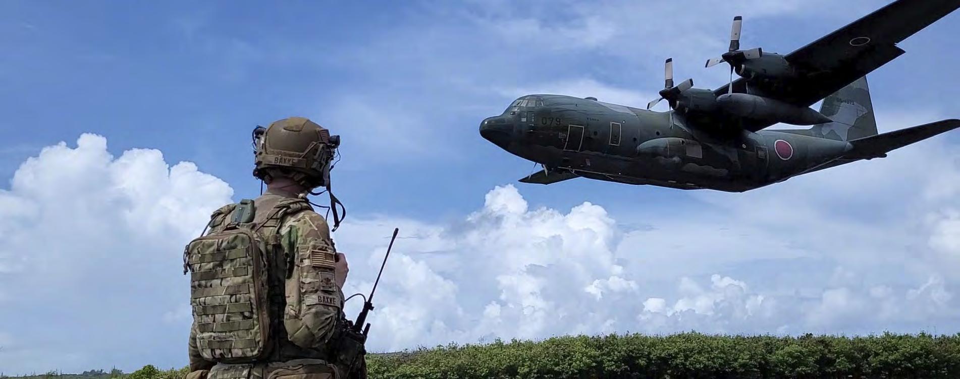 U.S.AirForceMaj.MichaelBakke,621stMobilitySupportOperationsSquadron,JointBaseMcGuire-Dix-Lakehurst,N.J.,watches asaJapanese C-130landsonBakerLandingZoneinTinian,U.S.CommonwealthoftheNorthernMarianas,July12.The621stMobilitySupportOperations Squadronmembers,airmobilityliaisonofficers,ExpeditionaryAirGroundLiaisonElementmembers,andJapaneseloadmastersparticipatedin exerciseMobility Guardian23, supportingthe coalitionlandingzone,drop zoneoperations and supportcargopreparation.