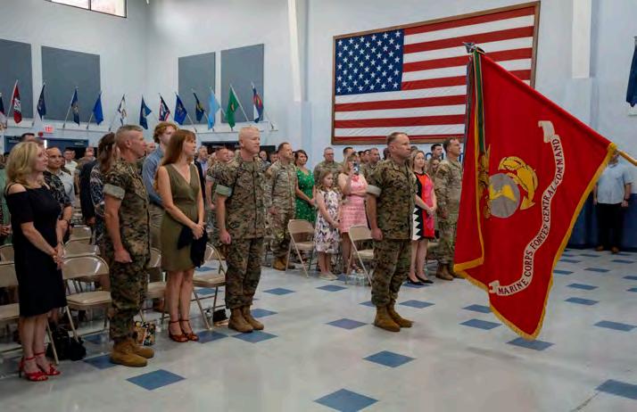 U.S.Marine CorpsMaj.Gen.ChrisA.McPhillips,incomingcommanderofU.S.MarineCorpsForces,CentralCommand,front,standsat attention duringachangeofcommandceremonyat MacDillAirForce BaseAug.1. USMARCENTisdesignatedasthe MarineCorpsservice componentforU.S.CentralCommandandis responsibleforallMarineCorpsforcesin the CENTCOMarea of responsibility.