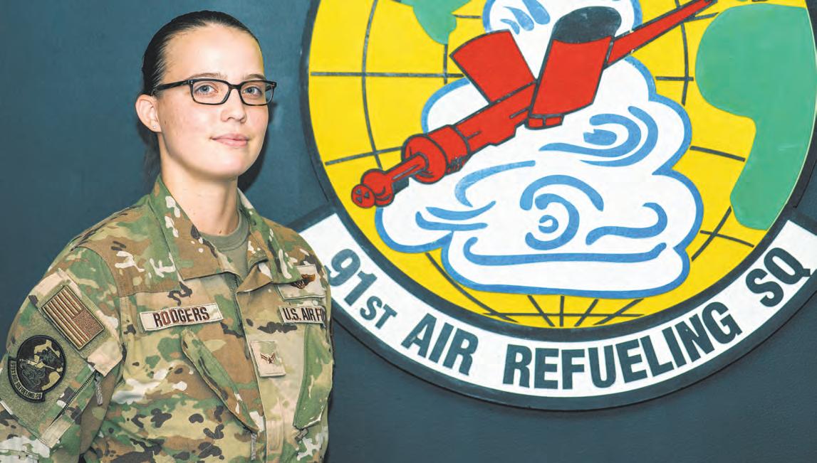 U.S.AirForceAirman1st ClassMackenzieRodgers, 91stAirRefuelingSquadron schedulerandboomoperator,posesforaphotonext toasquadronmuralatMacDillAirForceBaseAug.9. ChiefMasterSgt.oftheAir ForceJoAnneS.Bass recognizedRodgersatanallcallonbase,Aug.4,forher responseduring TampaBay AirFest2022wheresheprovidedcriticalfirstaidtotwo civilianworkers who were trappedunderneathacollapsedtent.Fortreatingthe civiliansusingherknowledgeoftacticalcombatcasualtycare,Rodgerswas awardedwiththeAirForce AchievementMedal.