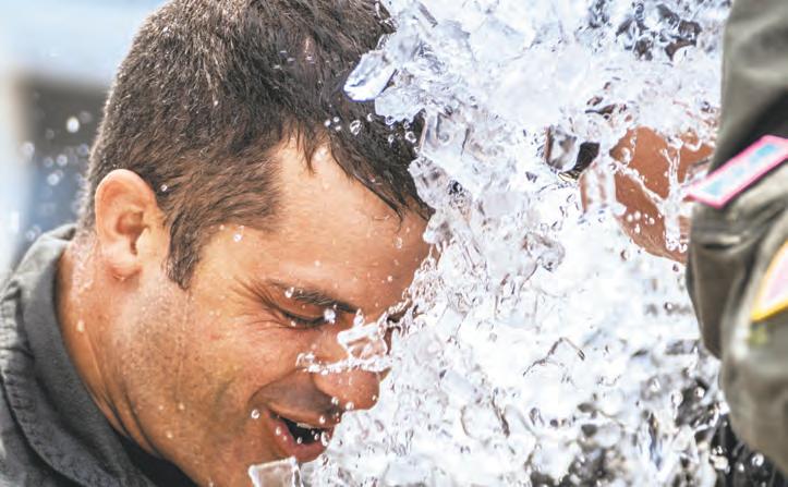 U.S.AirForceMaj.CurtisDejaco,50thAirRefuelingSquadronpilot, braceshimselffromabucketoficewateraftercompletinghisfinal flightwiththesquadronatMacDill Air ForceBaseAug.17.A“fini-flight” isatraditionalcelebratoryflightamongAirForceaviatorswhichmarks thelasttime apilotsflieswithanassigned unitoraircraft.