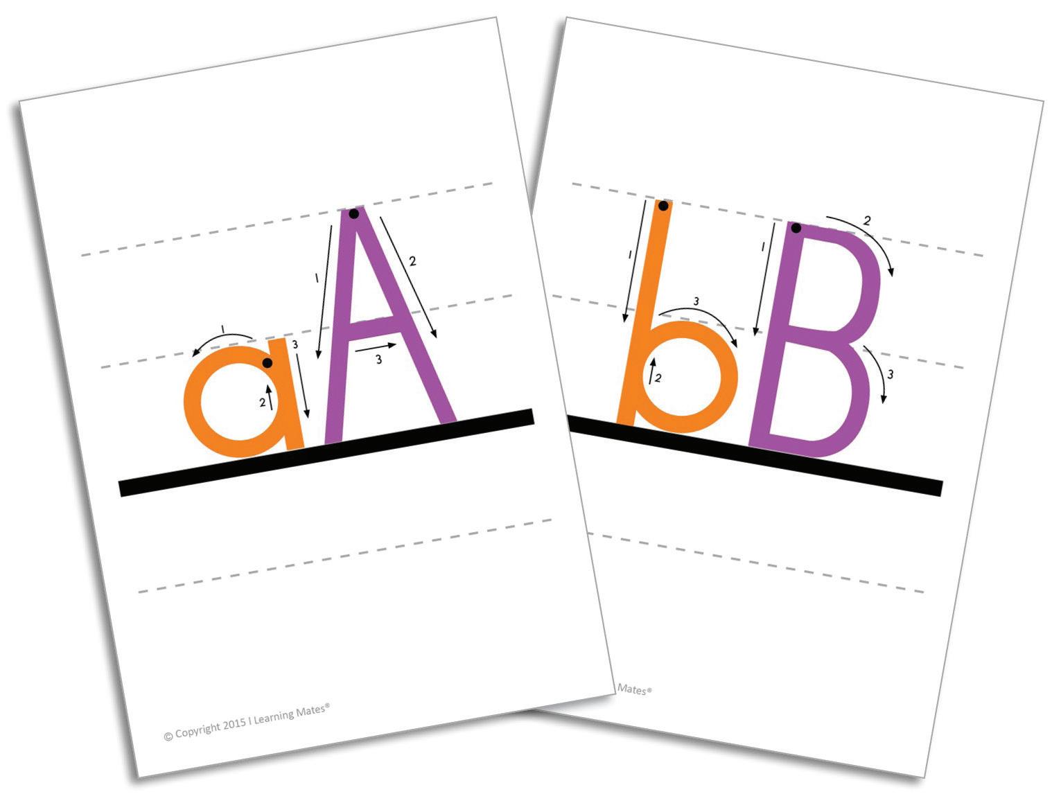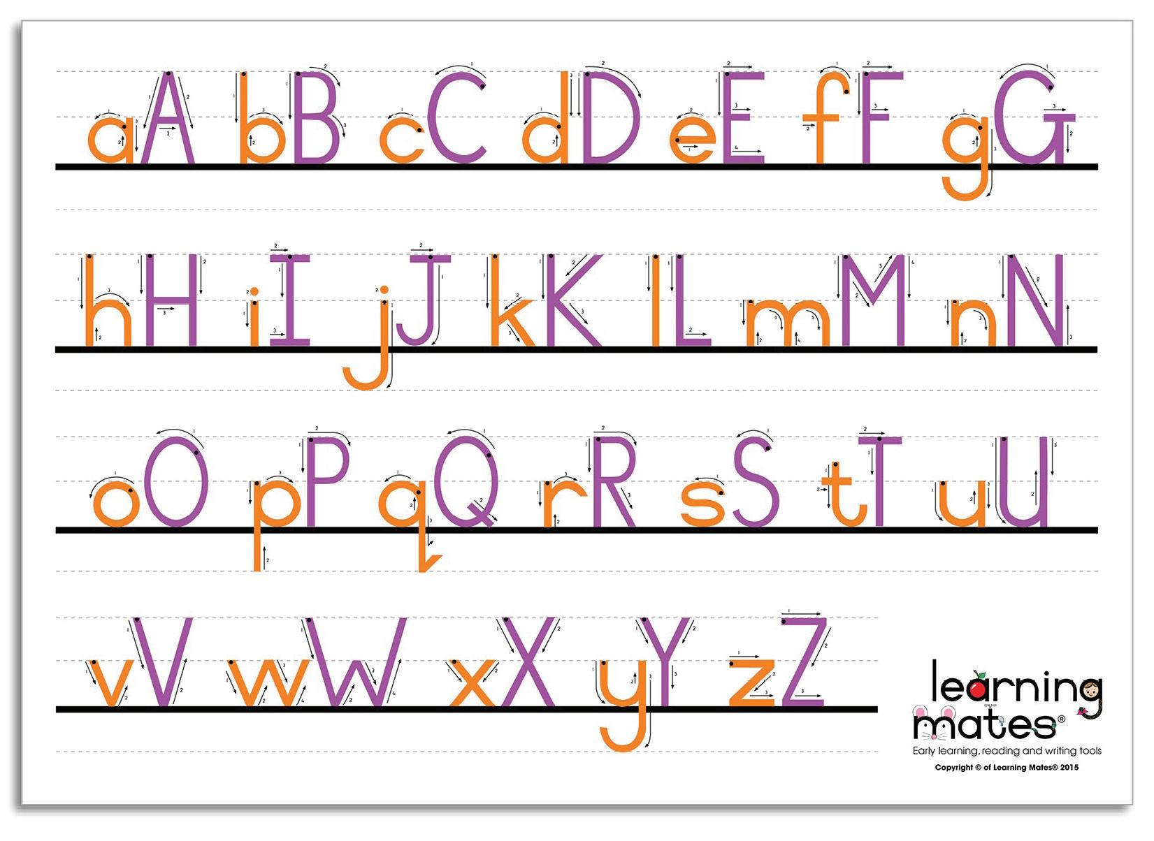 A5-sized set of 26 cards showing correct print letter formation with start dots and arrows. Ideal for introducing letters one at a time in any home language.