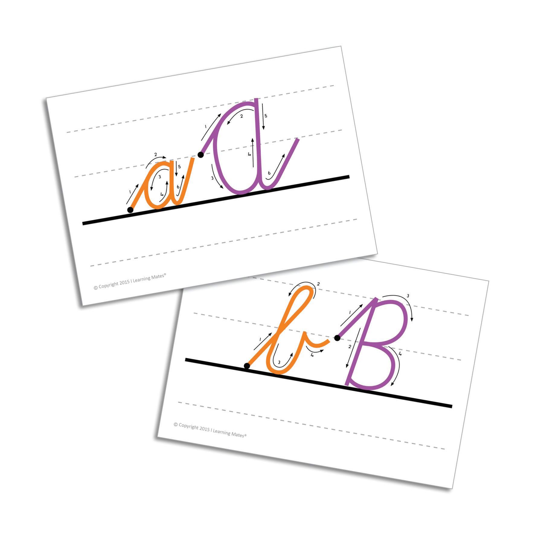A5-sized cards teaching cursive letter formation with directional arrows. Supports step-by-step introduction of cursive writing.