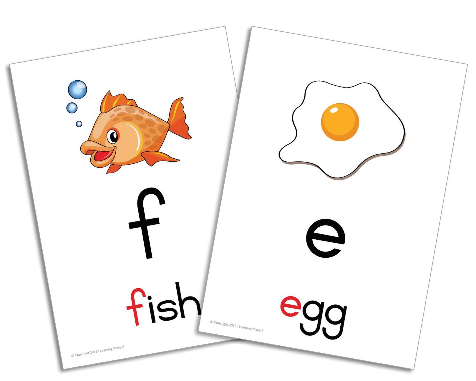 A6-sized, double-sided cards with classic letter and image pairings. One side shows the letter with a visual cue, the other shows the plain letter. Ideal for gradual phonemic learning and testing.