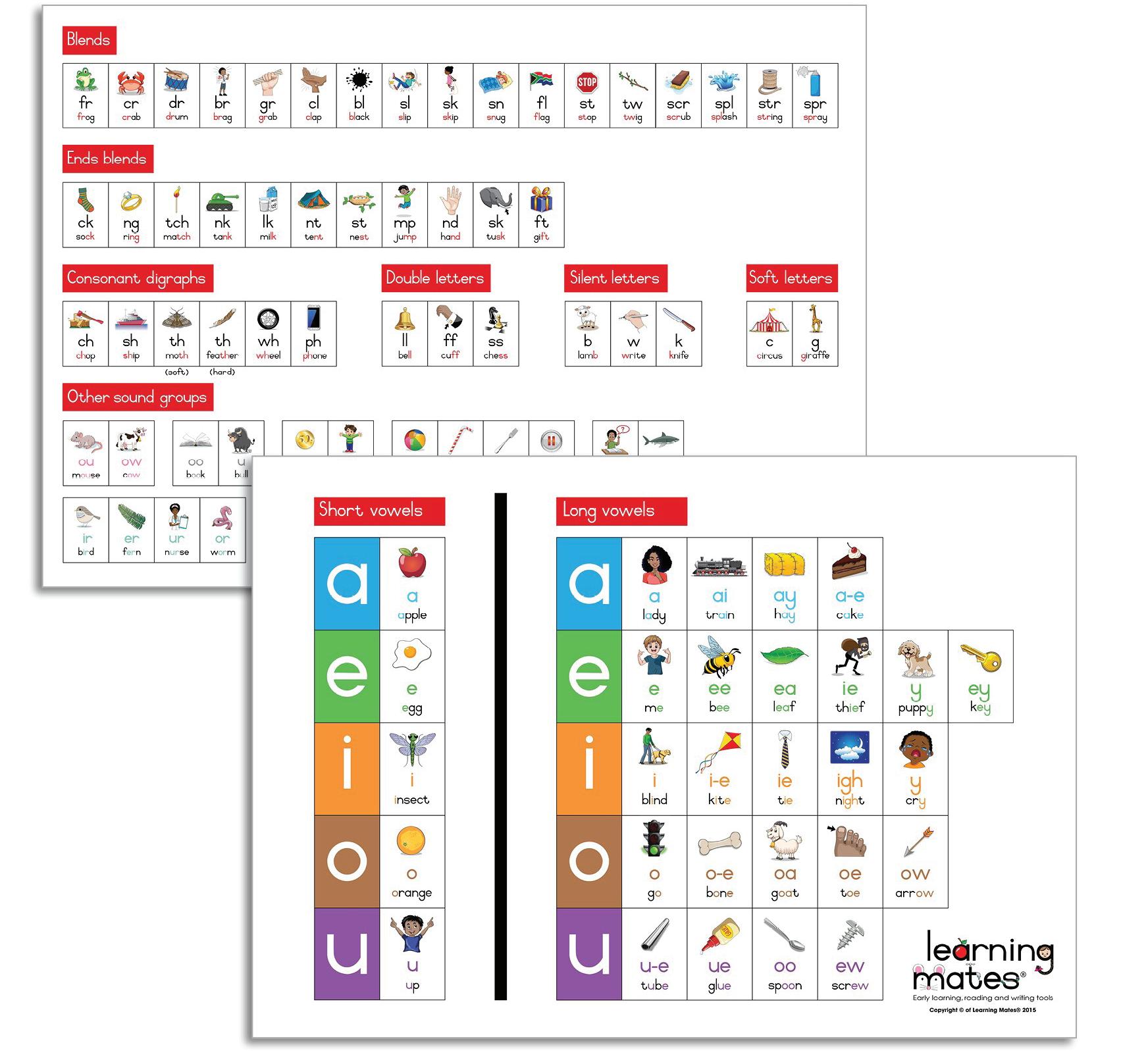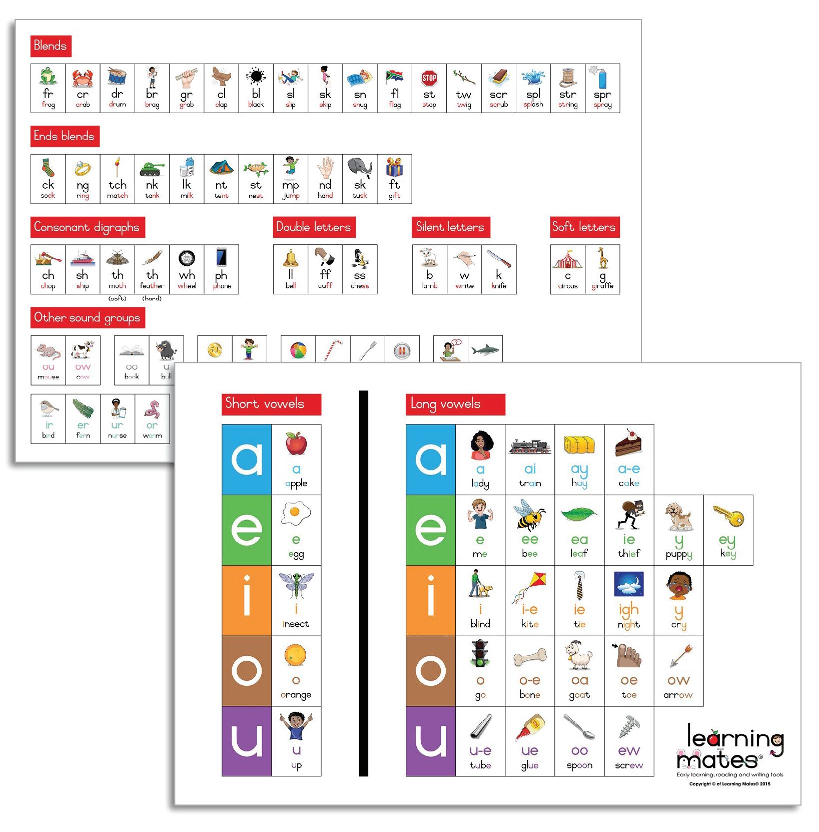 Two A4-sized charts for individual learner reference. Fits easily in school bags or chair bags for daily use. Includes all key phonics groups and vowel sounds.