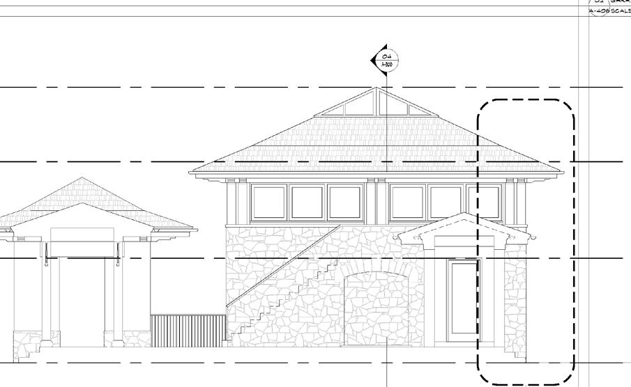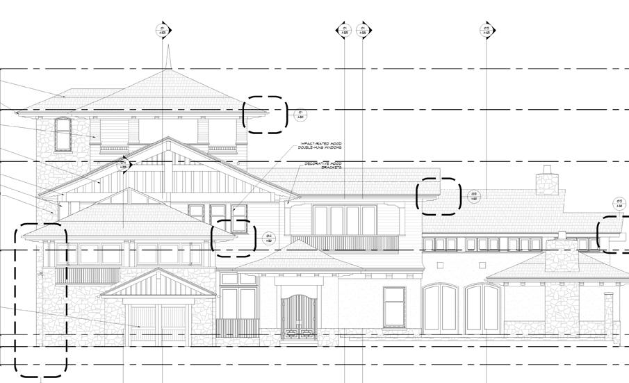 Construction Document site elevation of residence. Bohemian styled wood details complimented with exterior balconies facing the ocean.