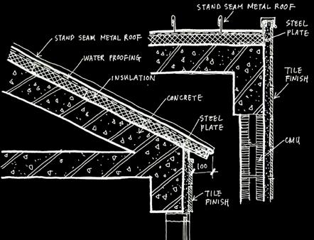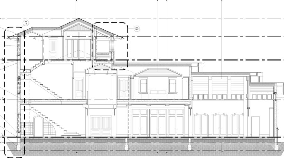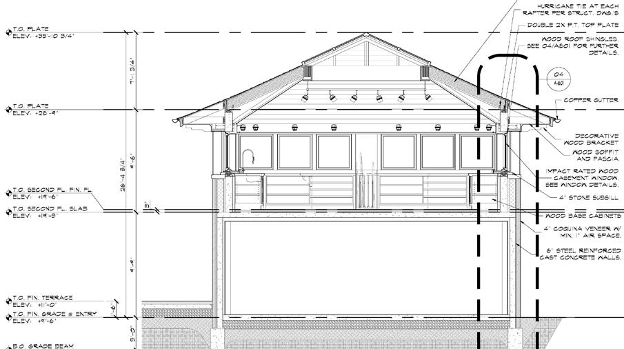 Construction Document section of artist studio, showcasing coquina stone veneers, cast concrete walls, and decorative wood detailing.