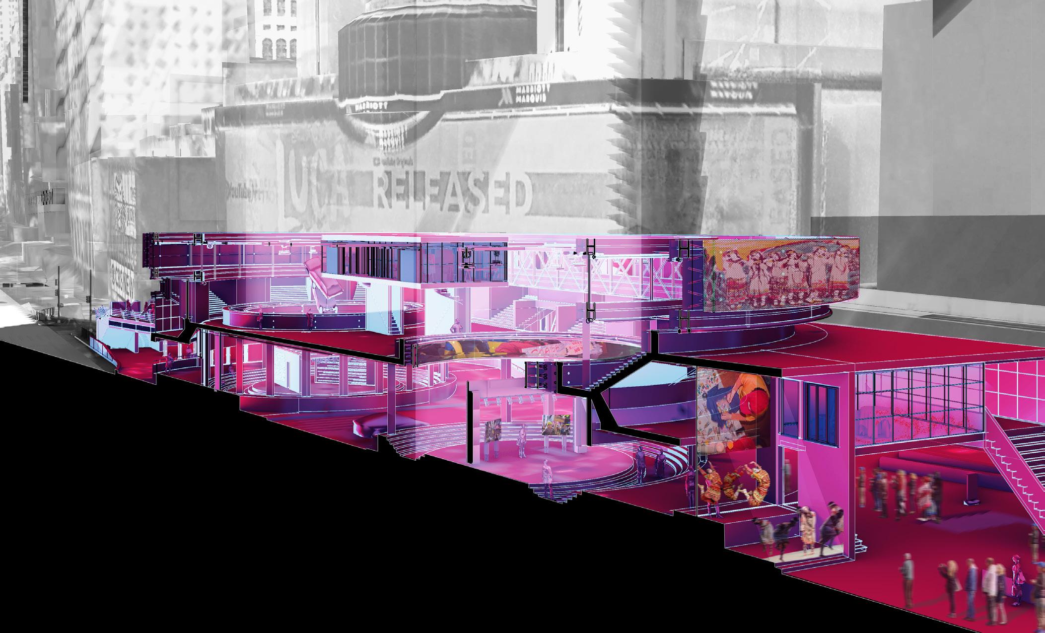 My thesis, entitled Radicalization of the Spectacle, explores the intersection between the urban conditions of New York City, Times Square, and the notion of radicalization. The term ‘radicalization’ refers to an extreme change in worldly affairs. This term is critical in understanding my view of architecture, as it suggests architecture must formatively react to changes in culture, climate, politics, etc. Moreover, the term ‘radical’ is aggressively progressive and favors social reform performance, adding an urgency for new ideas to form. Secondly, the term ‘Spectacle’ refers to a visually and spatially arresting event that is dramatic in occurrence.