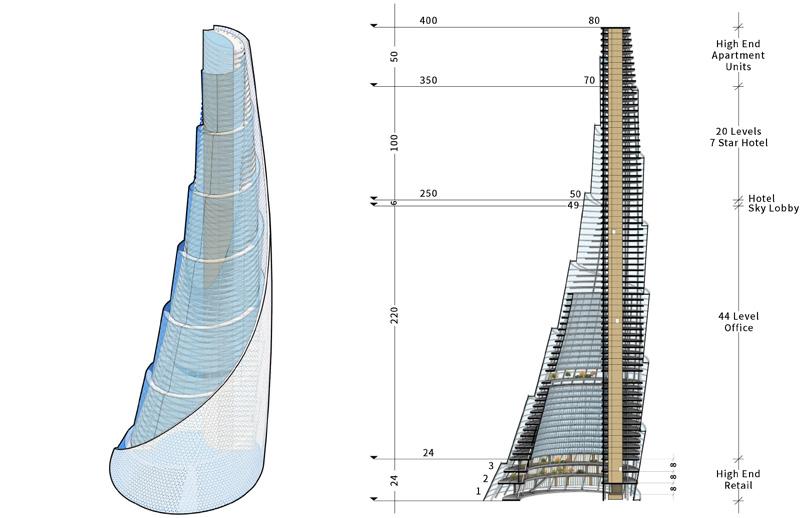 In developing the commercial base and façade articulation for the 80-storey tower, I led design explorations that established the tower’s architectural identity from the ground plane upward. Working in Rhino, Enscape, and D5, I produced iterative massing studies, podium interface analyses, and façade rhythm concepts that balanced performance, constructability, and visual impact. My work focused on shaping a commercial podium that activated the public realm through transparent retail frontages, shaded pedestrian arcades, and a sculpted structural expression that visually anchors the tower. I collaborated closely with senior designers to refine proportions, material strategies, and screen geometries, ensuring the podium and tower façade formed a cohesive vertical narrative while supporting programmatic requirements and maintaining design integrity throughout each iteration.