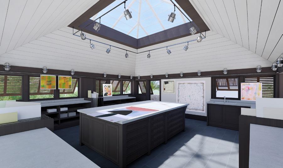 Pre-liminary rendered perspective of artist studio. View showing central artist station, pin-up walls, and overhead skylight.