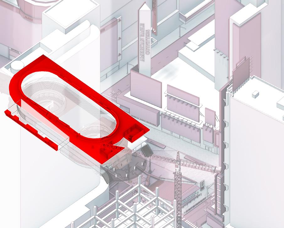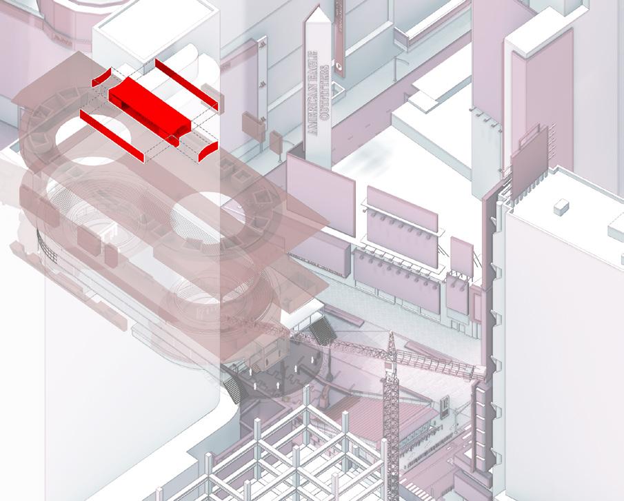 Prototype III would require a permanent installation within Times Square. Fundamentally, the structure would not change, but its radical displays would be in constant rotation. Prototype III’s Staged Spaces would allow for flexibility in performances. The Fly loft would allow for props, artifacts, and displays to be dropped down to the Contested Ground. The Archive could be controlled to allow access to the LCD screens located on the facade and interior.