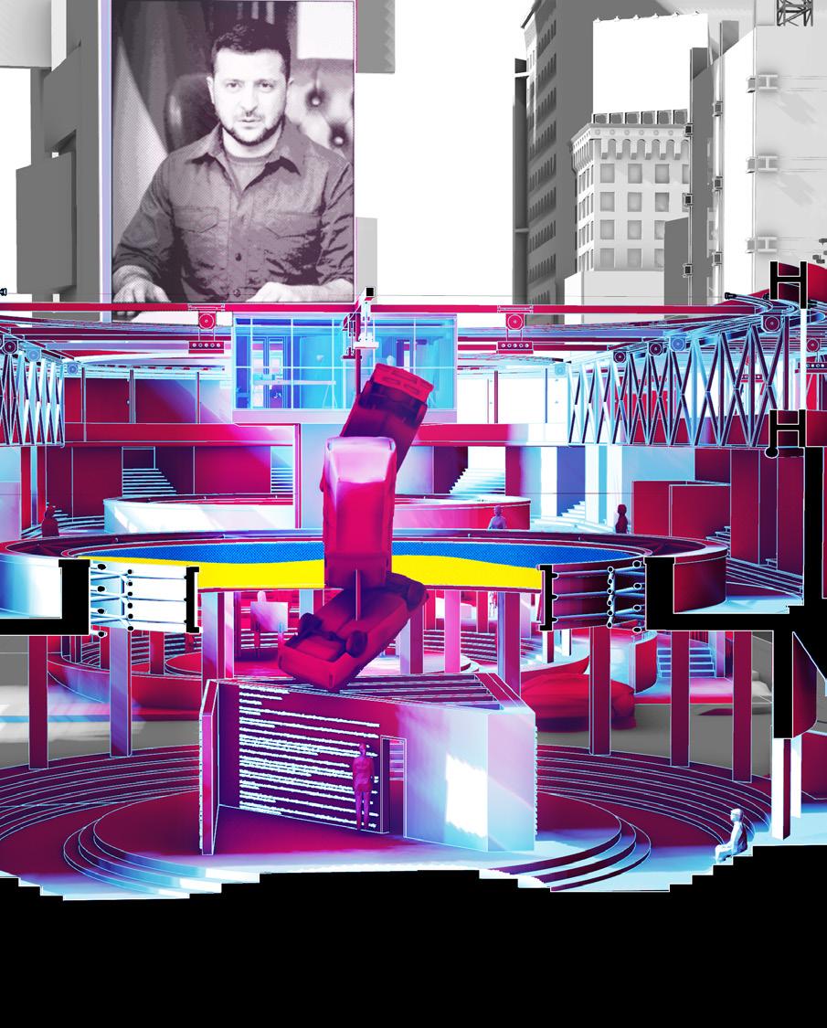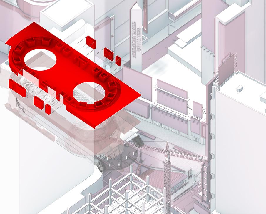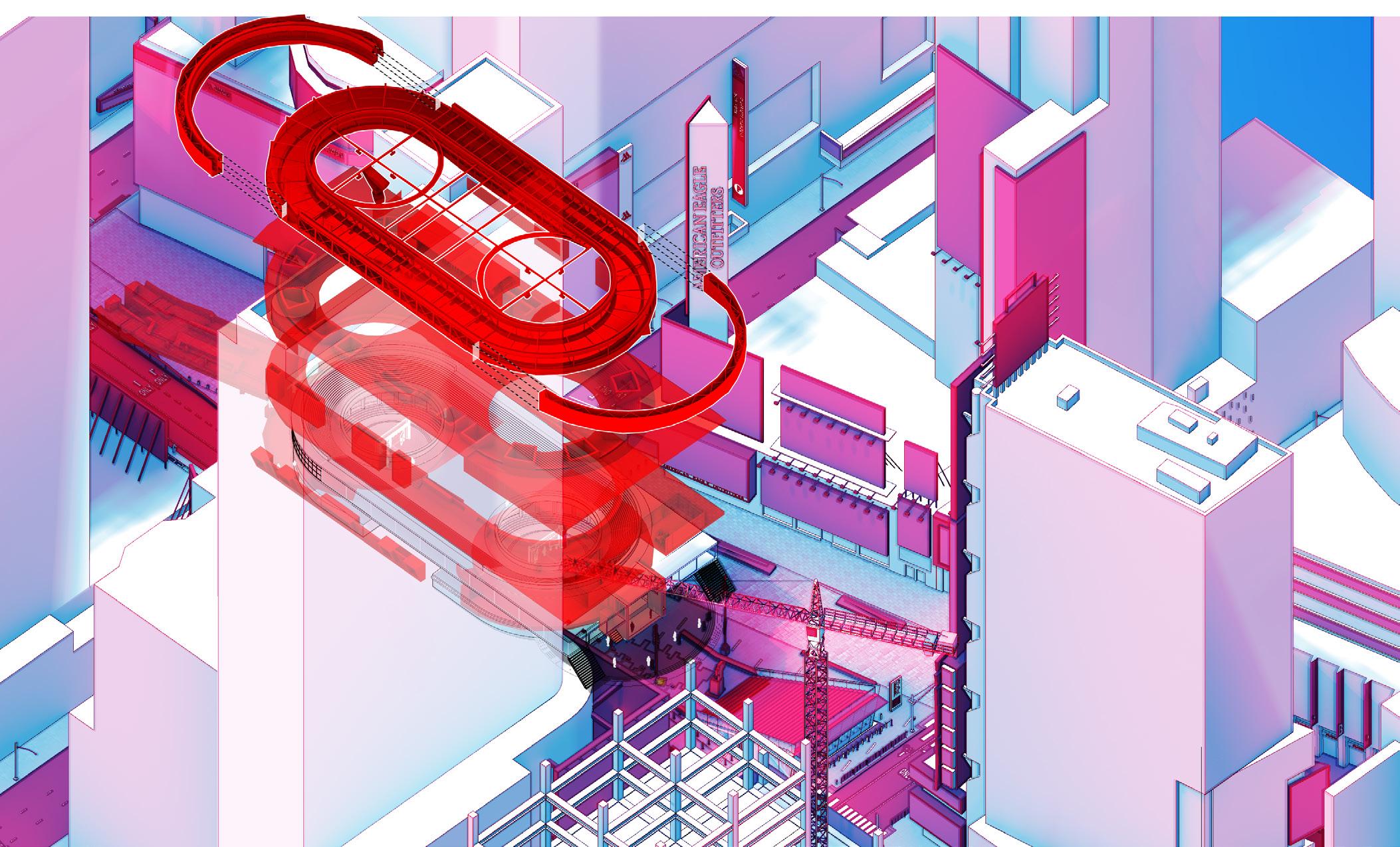 Exploded Axon rendering showing Contested Ground of Times Square | View facing the Staged Spaces.
