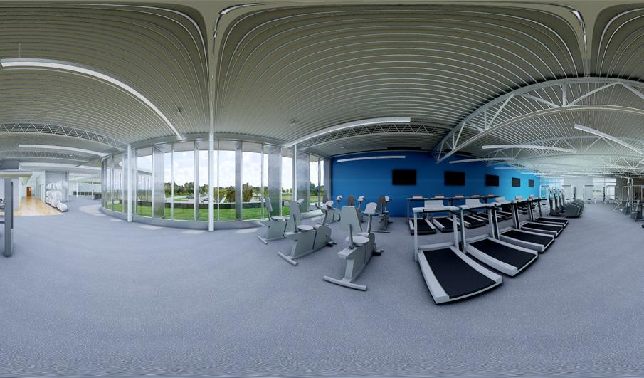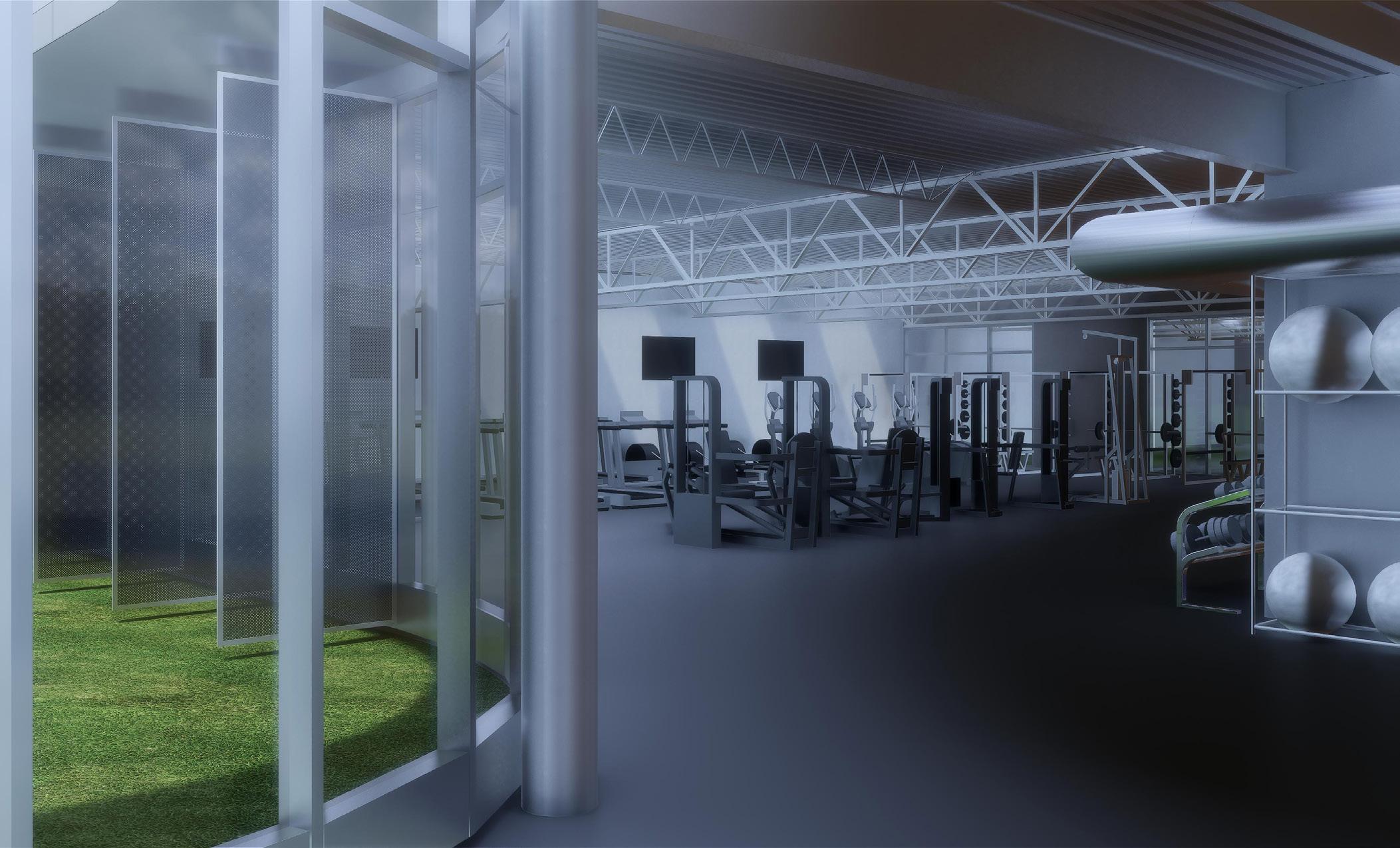 Perspective view looking at the 2nd-floor group exercise room. The shown rendering was produced in Enscape.