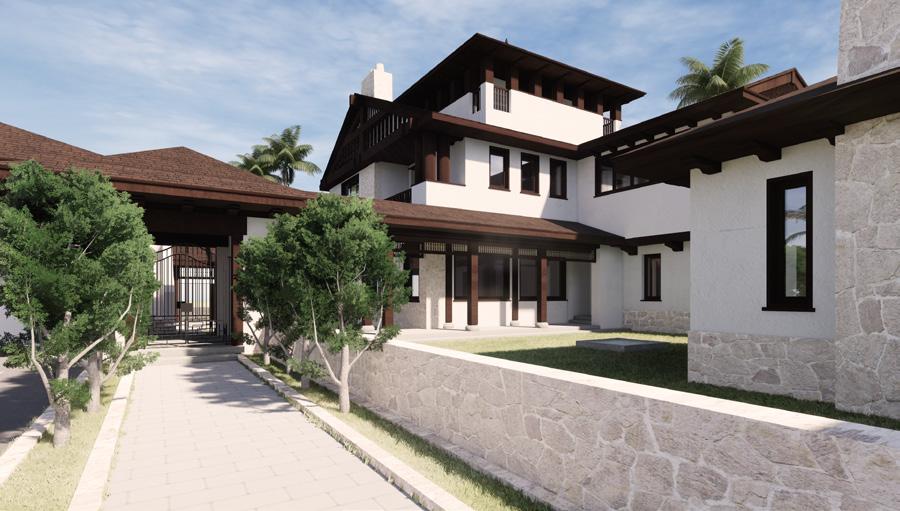 Pre-liminary rendered perspective of exterior loggia entry. View showing exterior cour tyard facing private office, living areas, and front foyer.