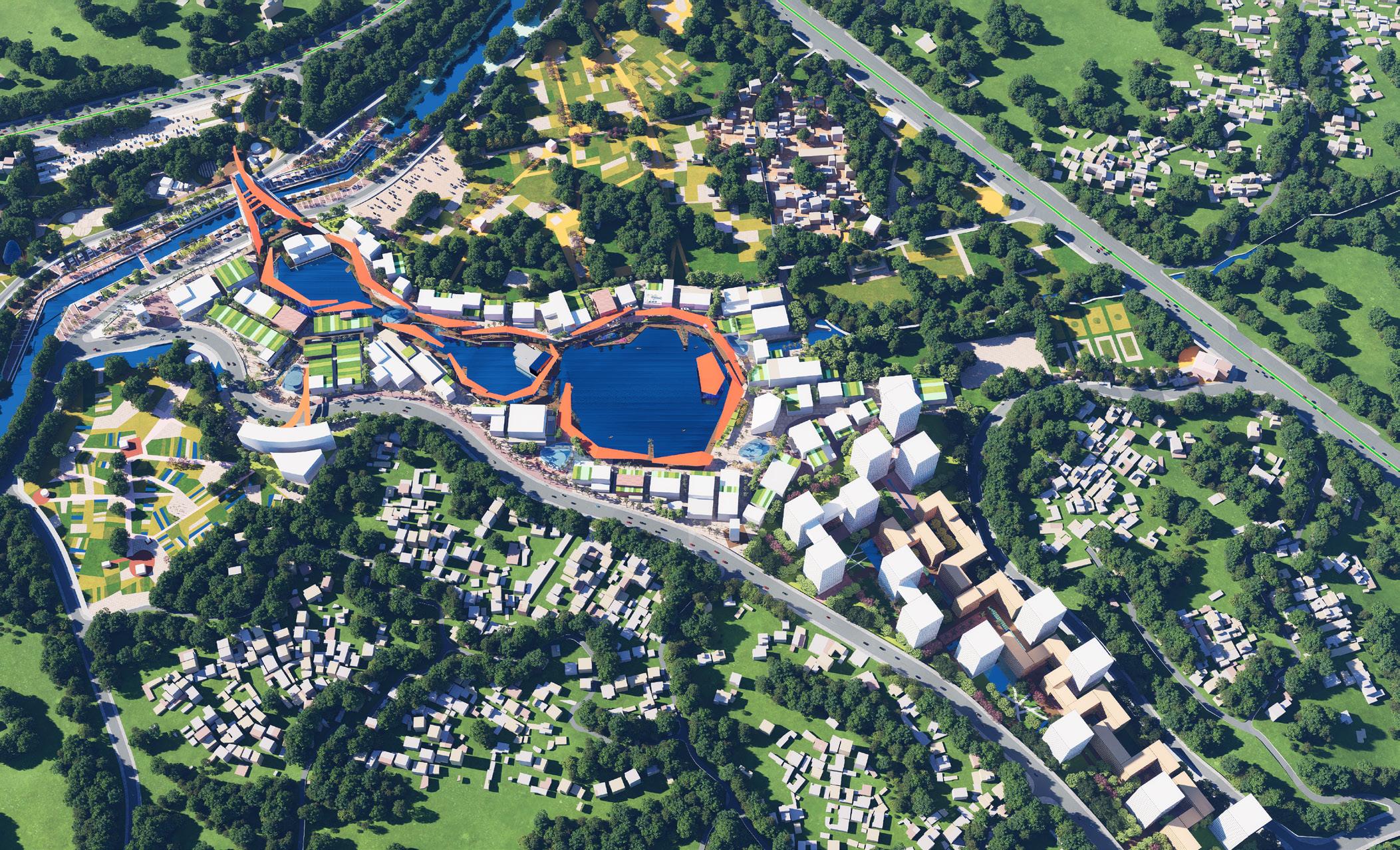 Master-Plan perspective view showing Phase 1 retail village and its envisioned embrace with the local lake. Beginning of massing studies.