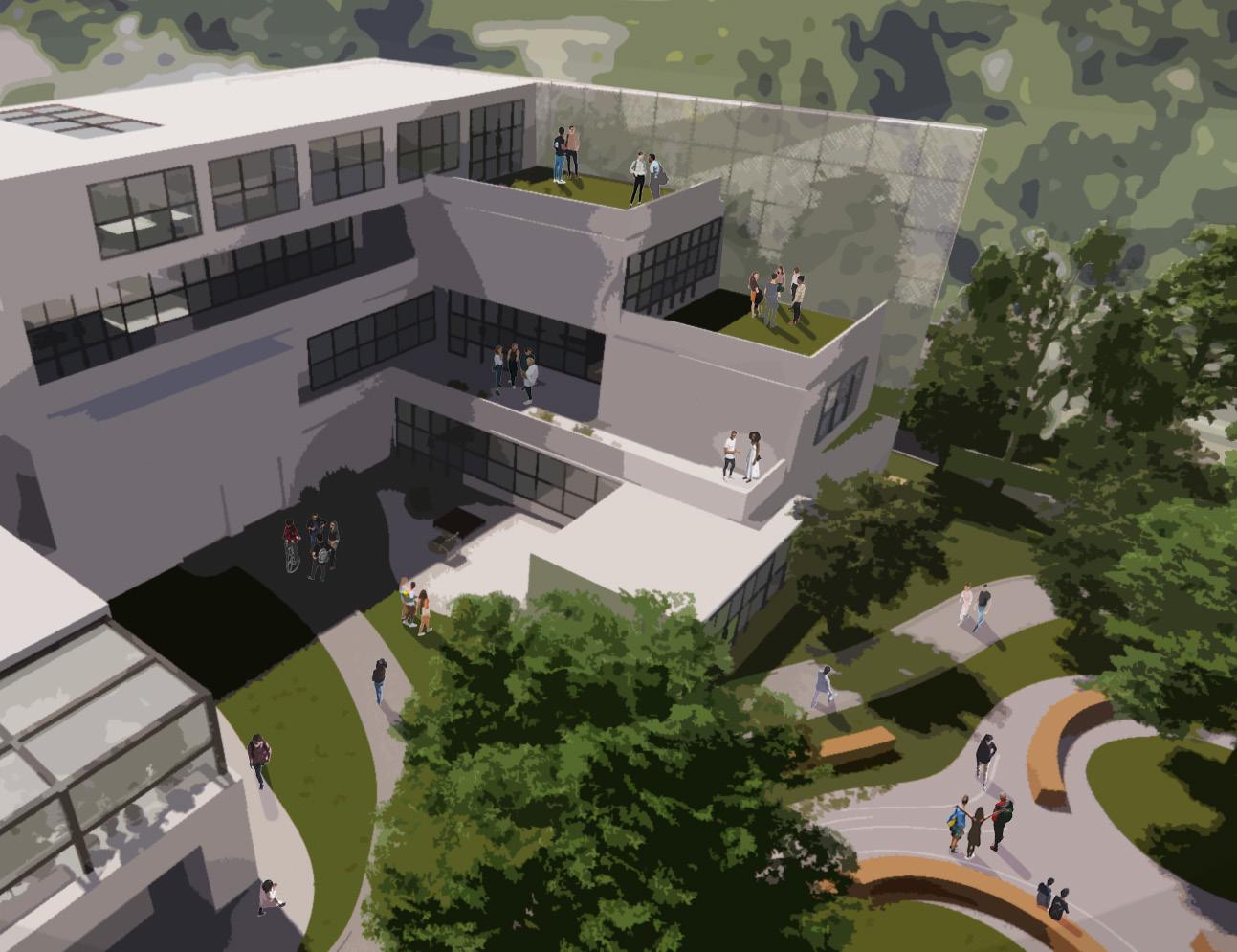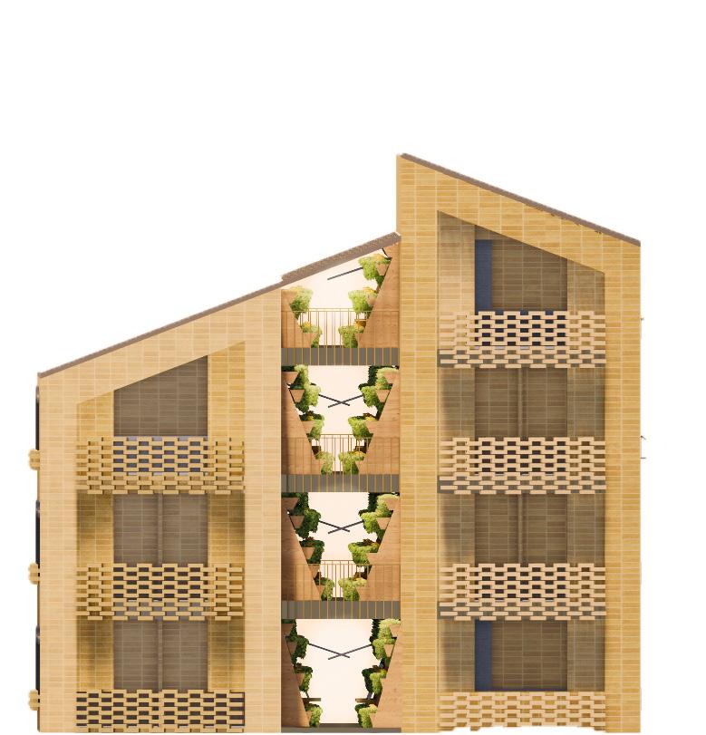 The stacked floors in the NorthEast corner are strategically shaped based on daylighting studies, ensuring optimal natural light throughout the building. This design allows sunlight to penetrate deeper into the space, enhancing brightness, reducing reliance on artificial lighting, and creating a dynamic, inviting atmosphere.