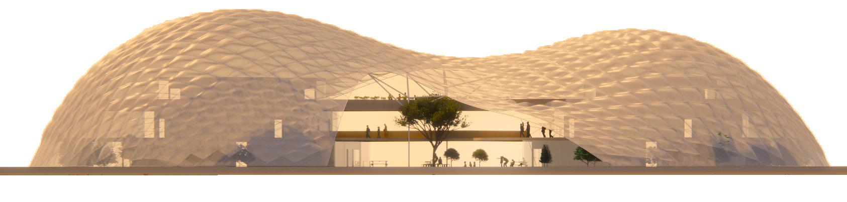 The ETFE facade forms a protective yet open-air canopy, seamlessly blending indoor comfort with outdoor freedom to create a safe, private, and dynamic learning environment.