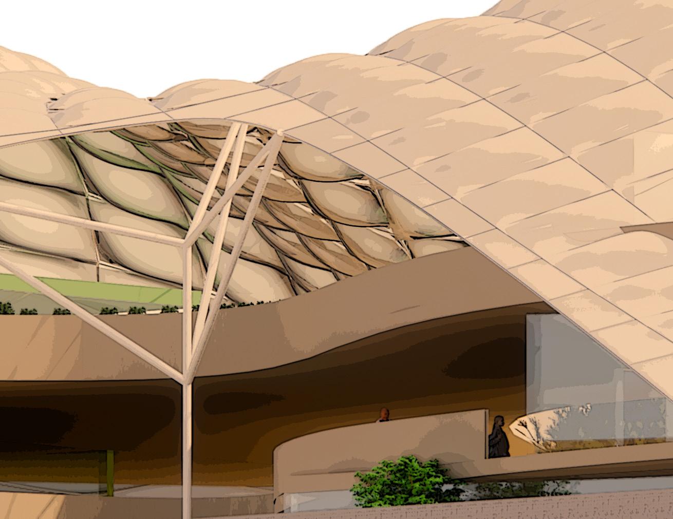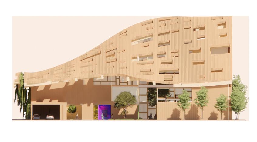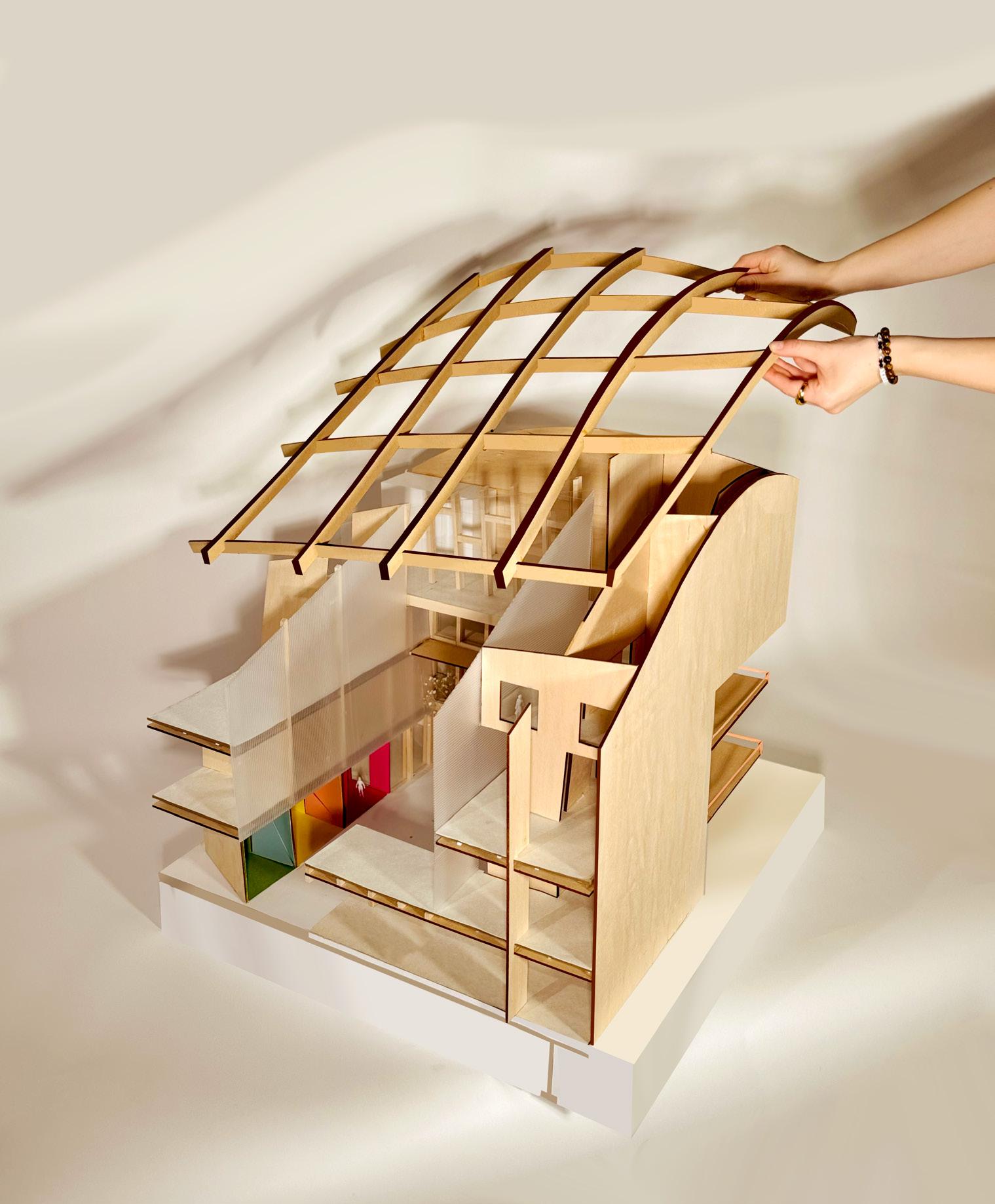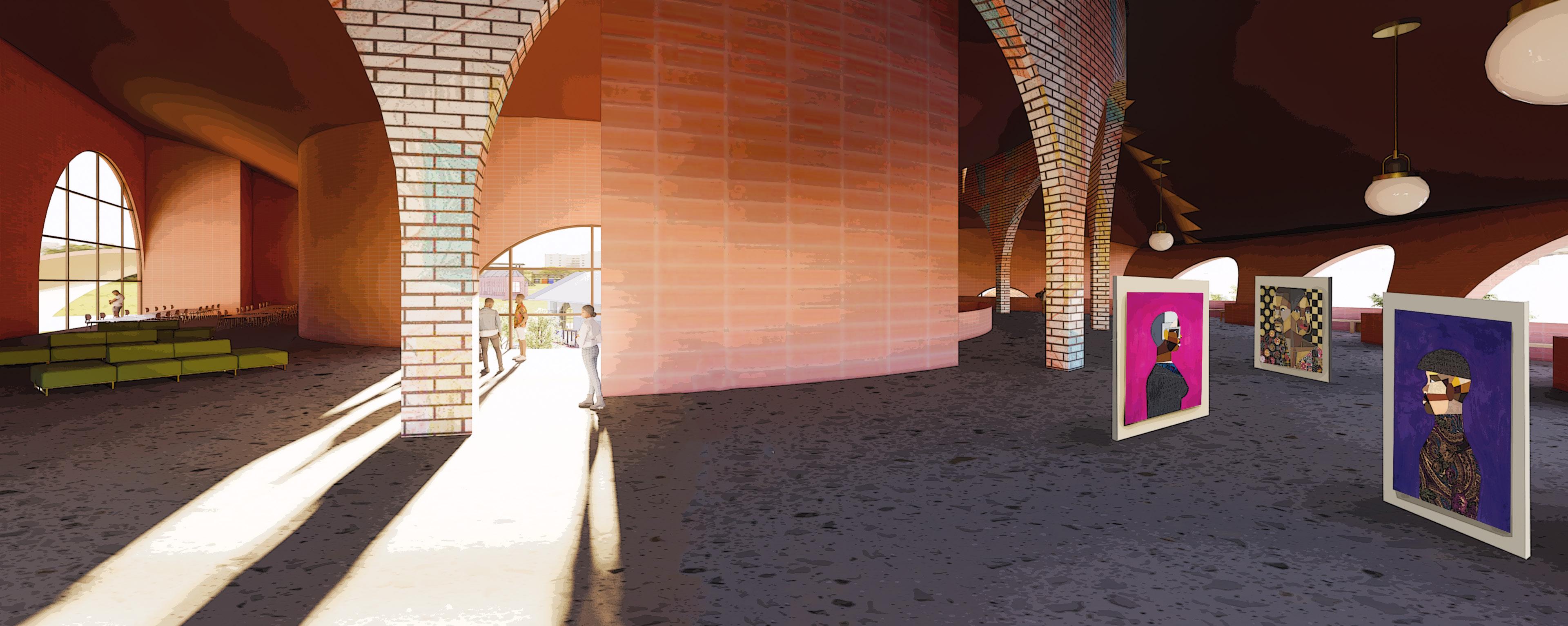 Inspired by this idea, the curved roof canopy is designed to maximize natural light and create dynamic visual connections inside and outside the galleries. Framed openings filter sunlight through curated apertures, casting ever-changing patterns on gallery walls while offering glimpses of the surrounding environment. This interplay of light, space, and perspective fosters a quiet dialogue between art, architecture, and the world beyond.
