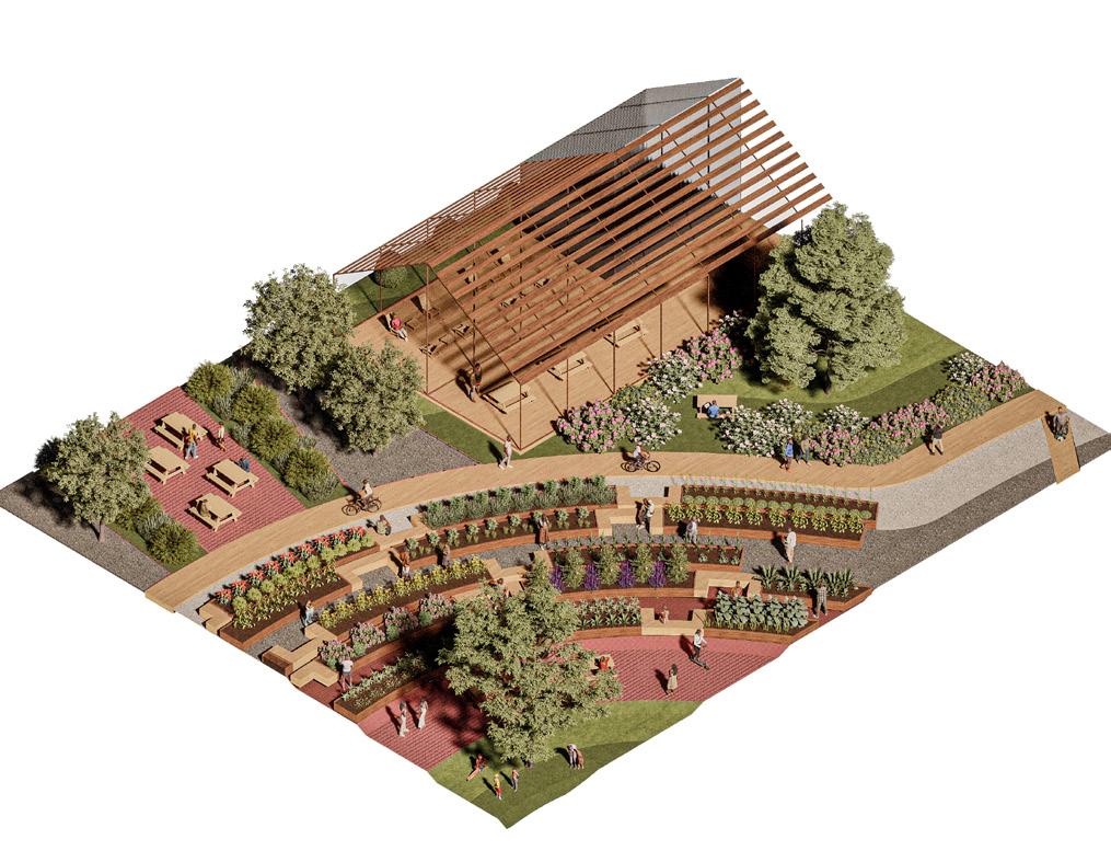 Inspired by Joyce J. Scott, Baltimore’s queen of storytelling through beadwork and quilts, this design stitches together once-divided neighborhoods. Like her intricate patterns, the landscape, murals, and walking paths weave a narrative of unity. Ground murals act as wayfinding devices, linking key spaces and reflecting our guiding principles—connect, grow, and gather—turning the ground into a canvas that tells the community’s story as it was meant to be told.