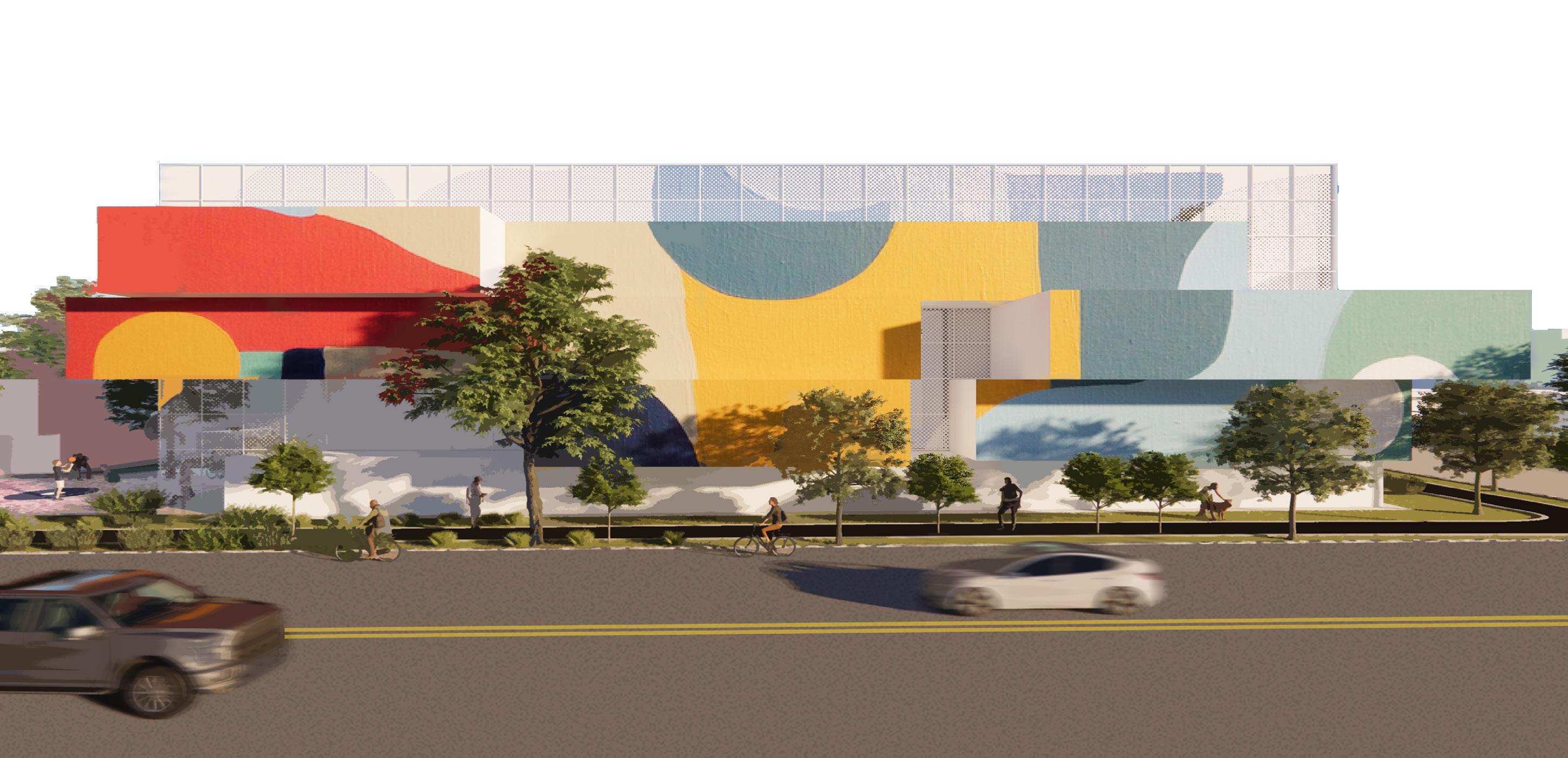 The lofted co-housing neighborhood creates an open-air public space beneath, transforming it into a dynamic outdoor art park. Rotating exhibitions feature local and street artists, showcasing their work in enclosed display cases, ensuring visibility and protection while fostering a vibrant cultural exchange.