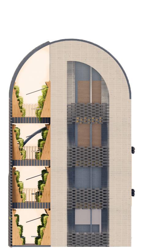 A lightweight ETFE facade enhances safety, shading, and ventilation with fritted patterns, solar control coatings, and dynamic inflation systems for passive solar control. Cascading greenery, glass paneling, and outdoor balconies create a biophilic, snow globe-like environment, seamlessly merging structure and nature. The building itself becomes a teaching tool, immersing students in innovative design and engineering.