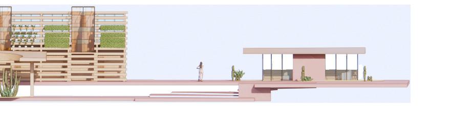 The Lofted Co-Housing Pods elevates 5 Pods of 50 units with shared kitchens, lounges, and outdoor spaces. Their horizontal design mirrors desert land scapes, stretching rather than towering to foster openness, connection, and fluid engagement with the spaces below