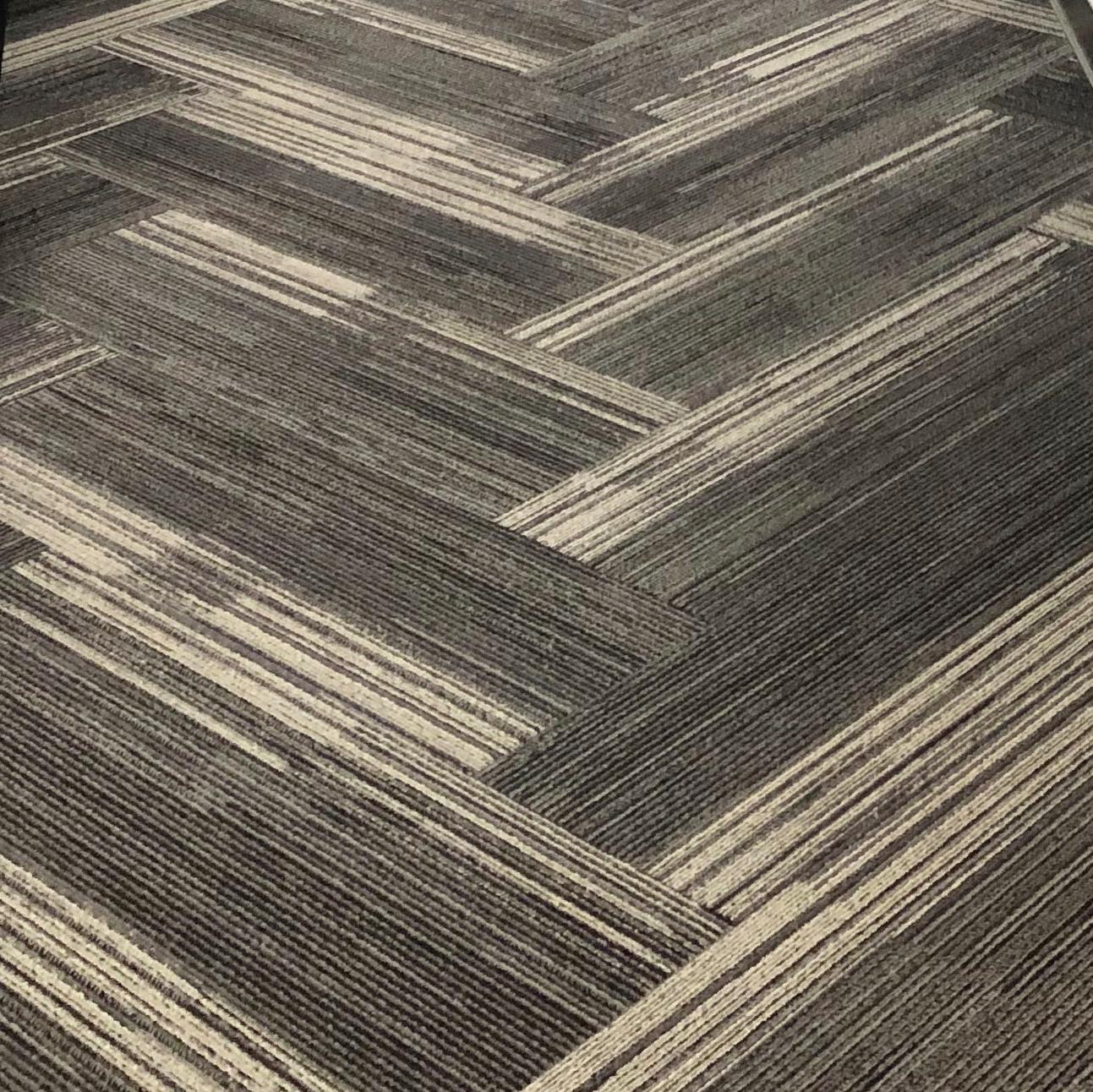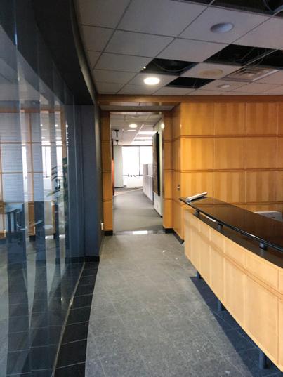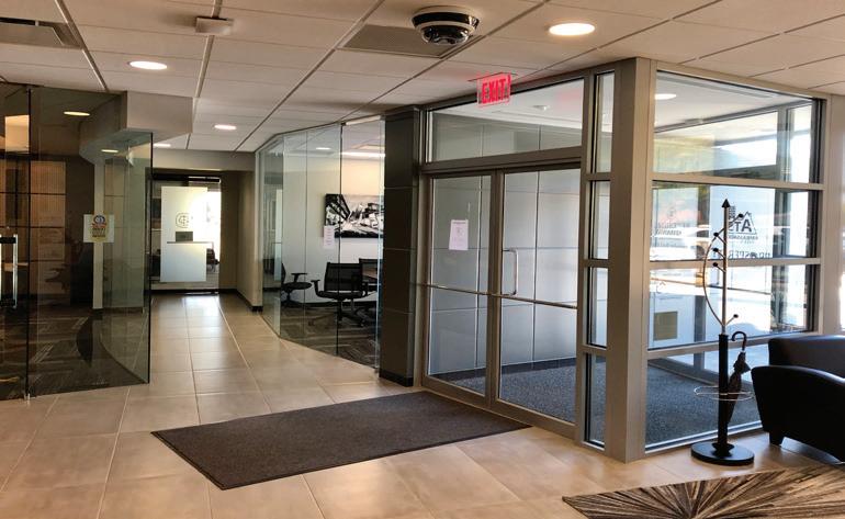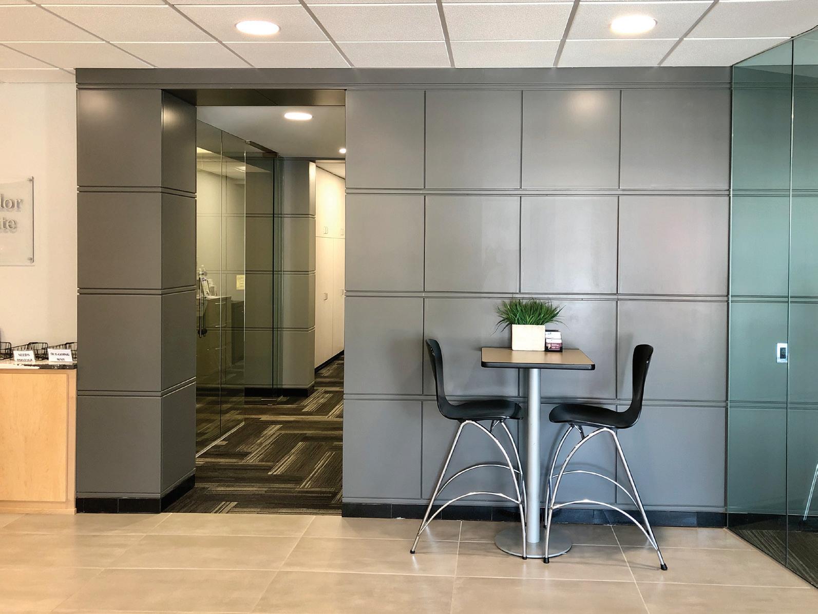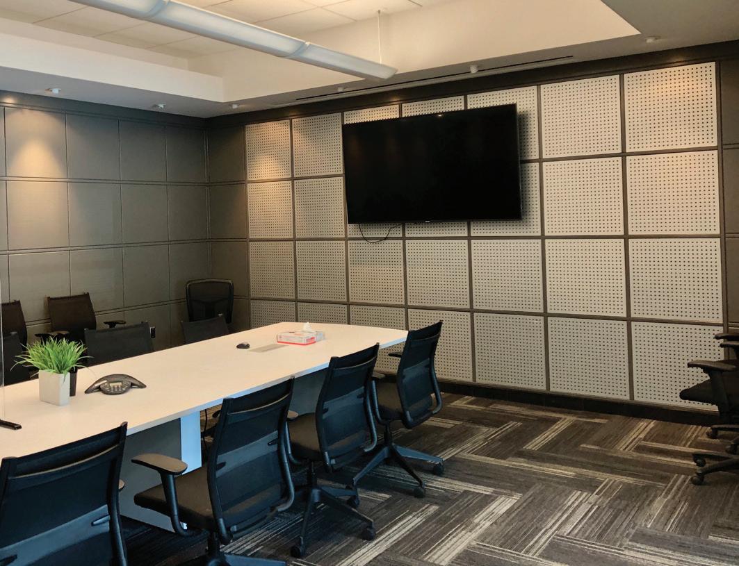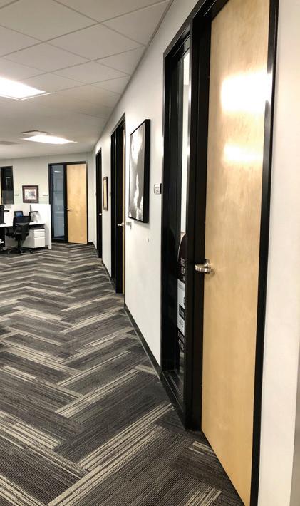 This tenant renovation project included adding offices and open office space to an existing building while bringing new life to the space with modern finishes. This palette features high contrast colors with warm wood tone accents. The existing space displayed outdated wood paneling throughout the office. In order to utilize this detail into the new design, the panels were painted dark grey to serve as accent walls. The bold herringbone patterned carpet tiles add interest and contrast to the office areas while large format tiles give the lobby an upscale feel.