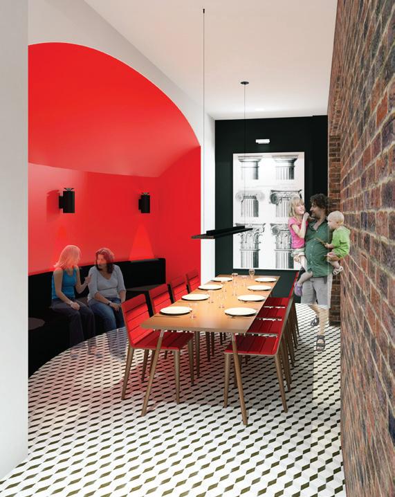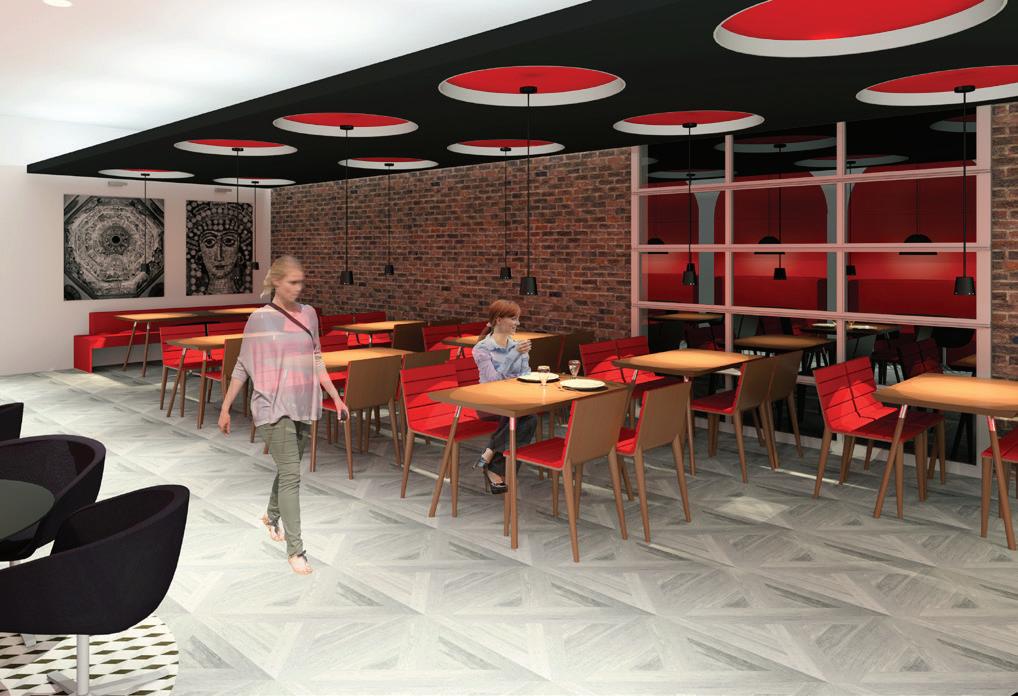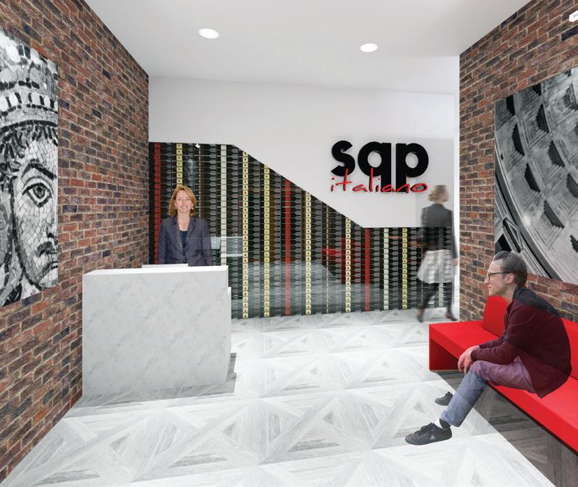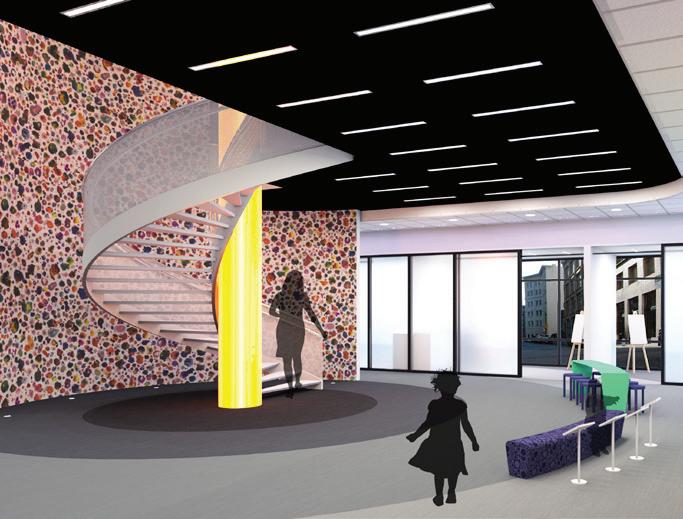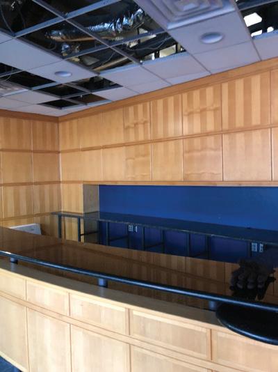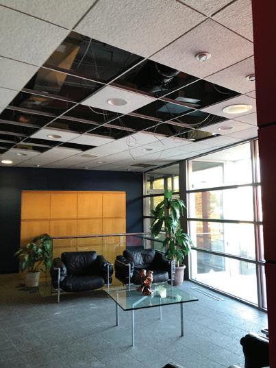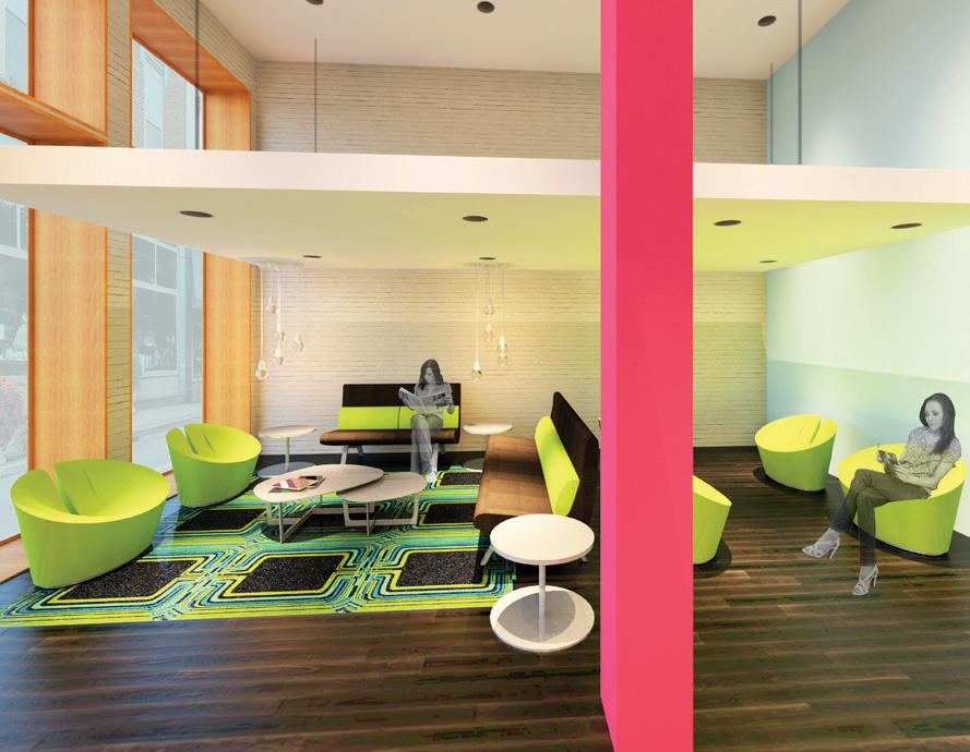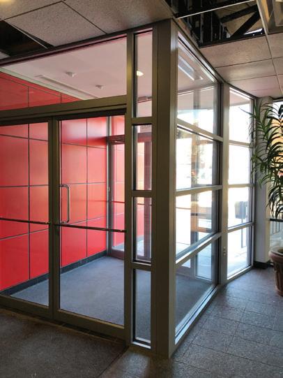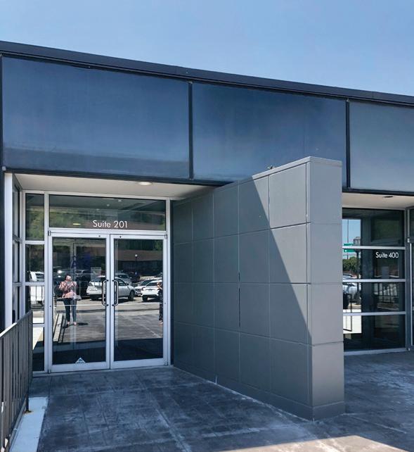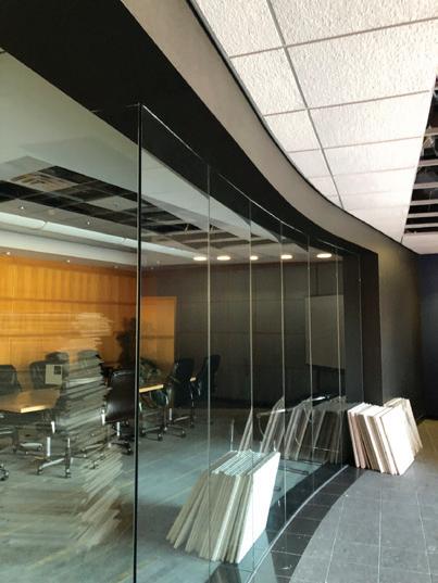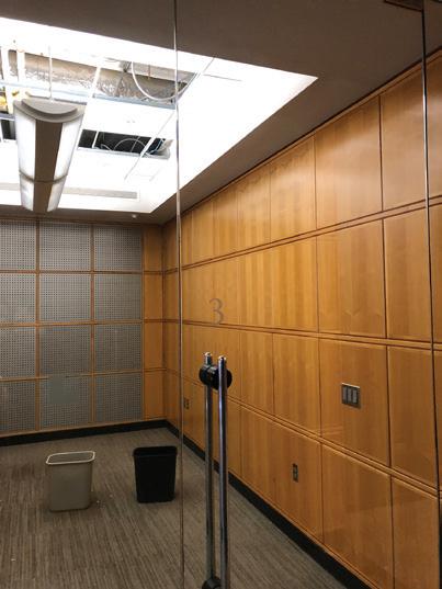 This tenant renovation project included adding offices and open office space to an existing building while bringing new life to the space with modern finishes. This palette features high contrast colors with warm wood tone accents. The existing space displayed outdated wood paneling throughout the office. In order to utilize this detail into the new design, the panels were painted dark grey to serve as accent walls. The bold herringbone patterned carpet tiles add interest and contrast to the office areas while large format tiles give the lobby an upscale feel.