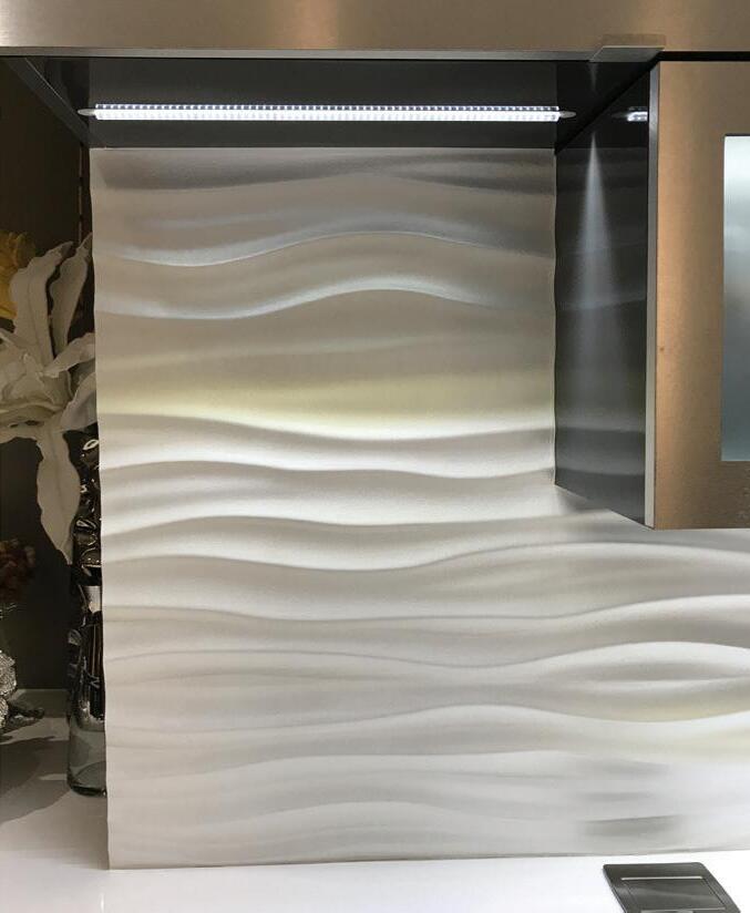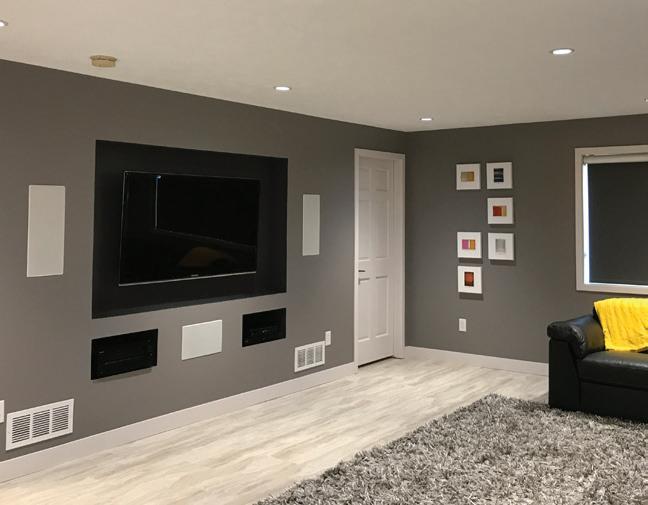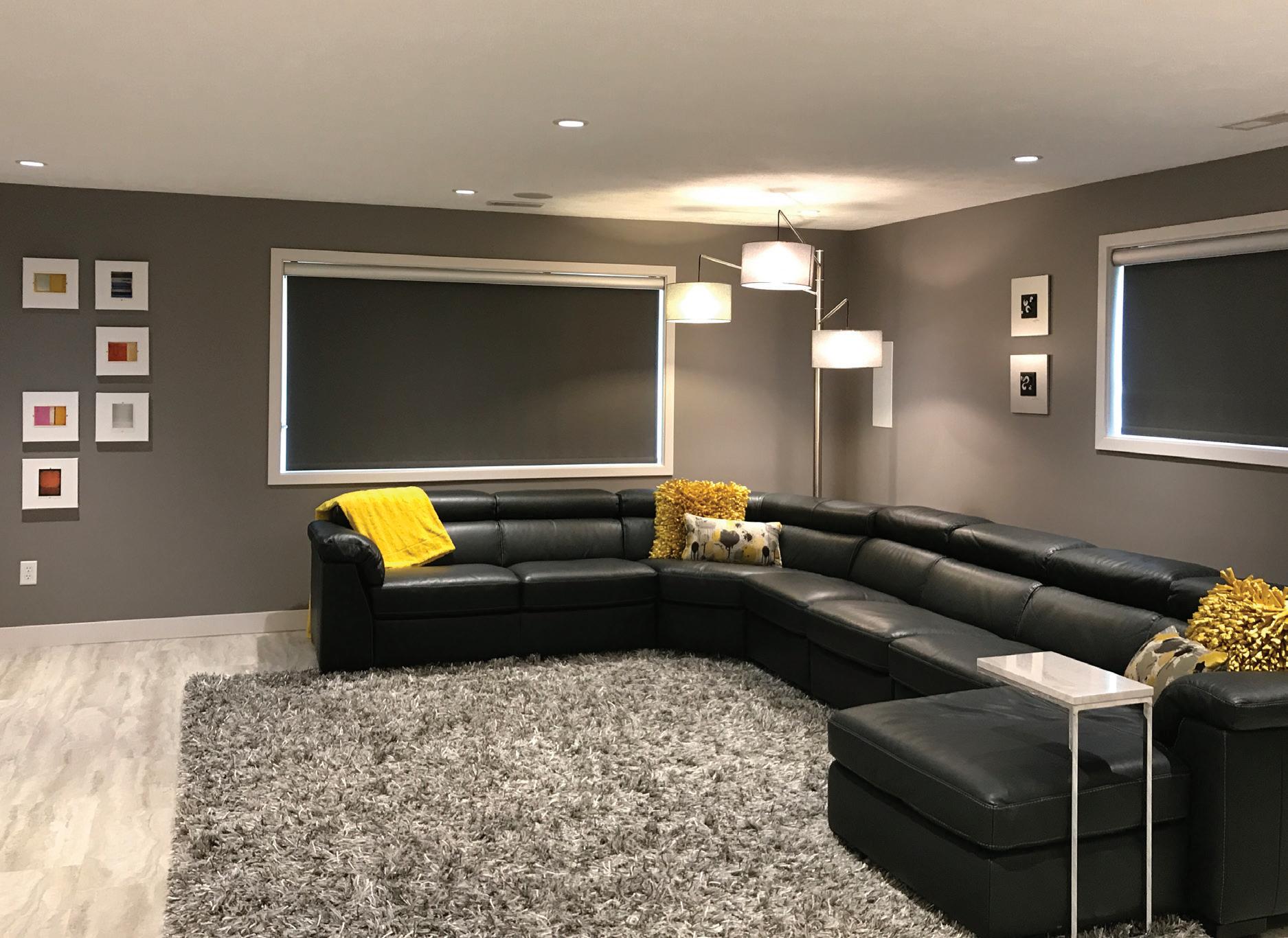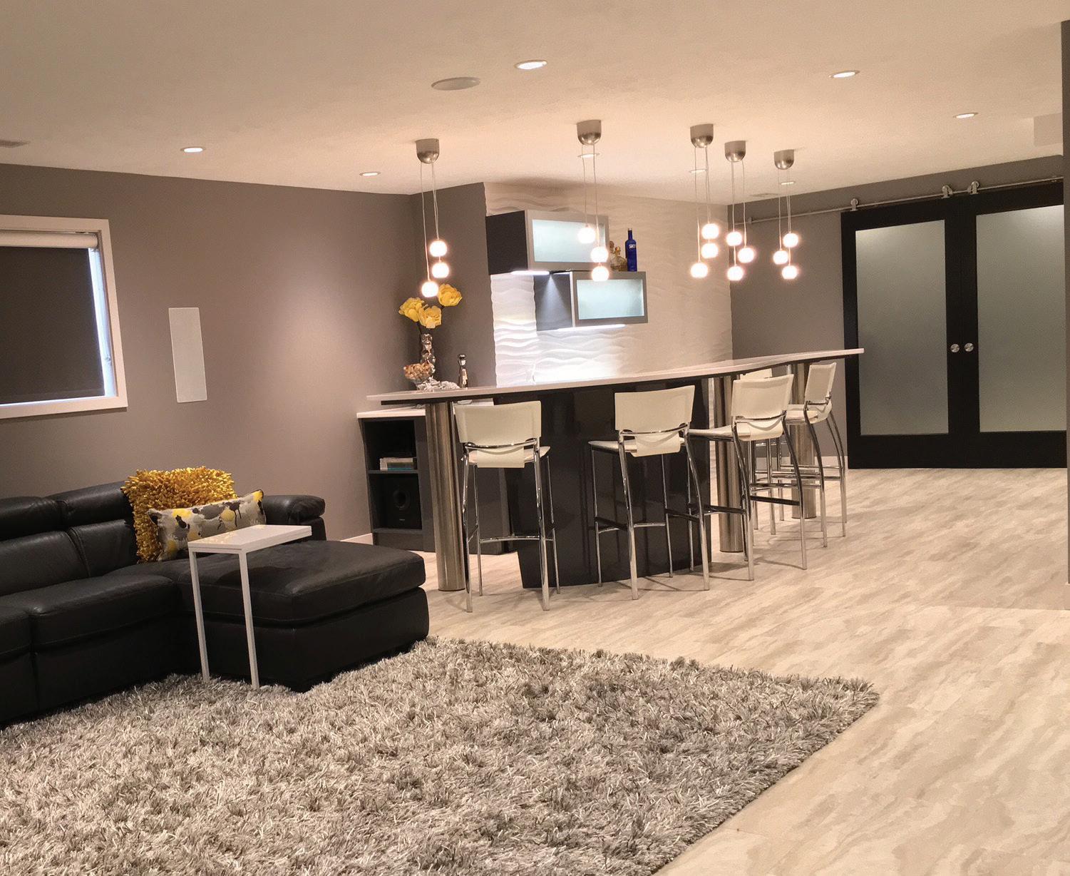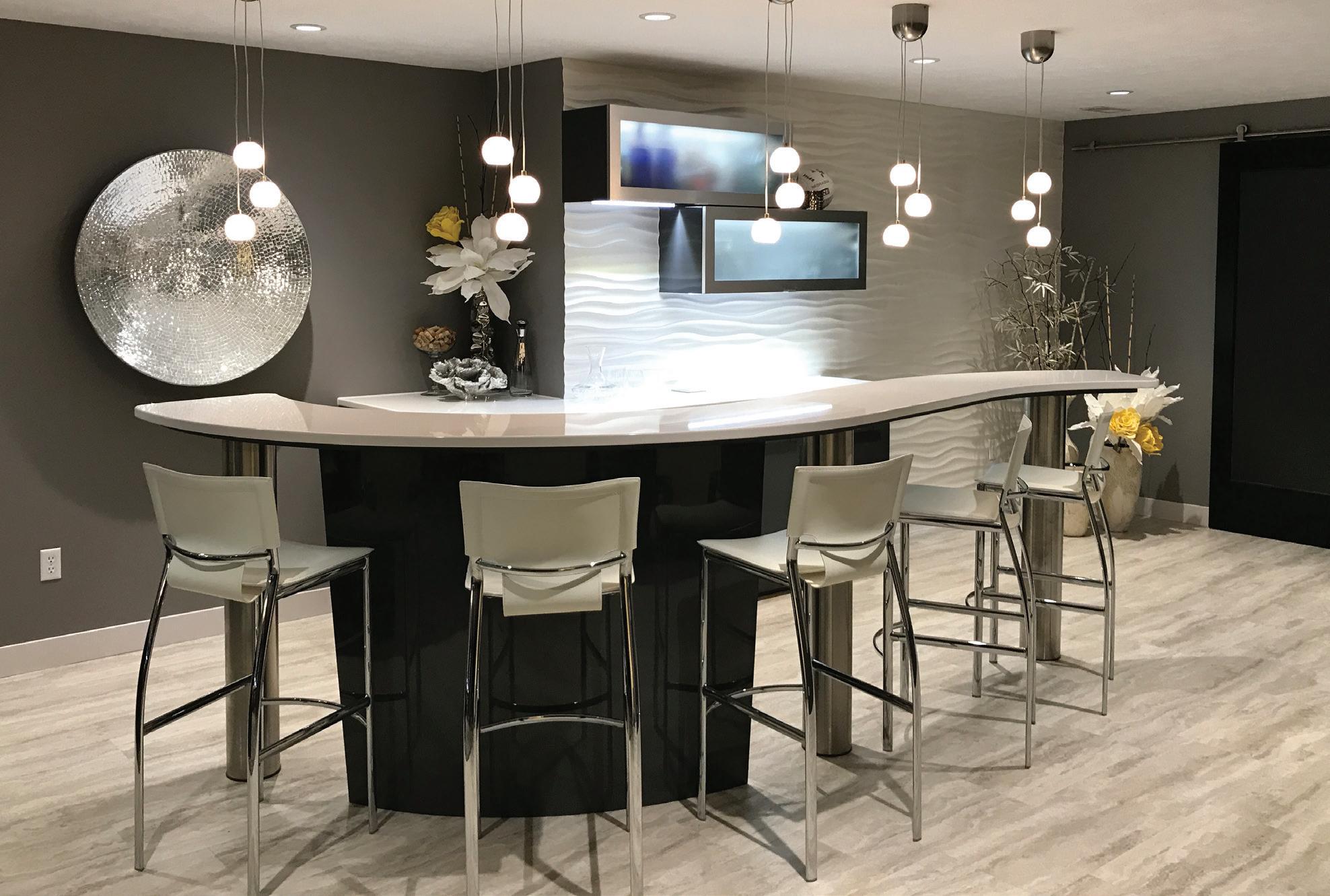 The goal of this project was to transform a traditionally styled basement into a modern multi-functioning space with purpose. In order to achieve this, the large open room was divided into three different zones: a living area, bar area and bonus room. The design highlights a three-dimensional wave textural focal wall that mimics the shape of the custom curved bar island.