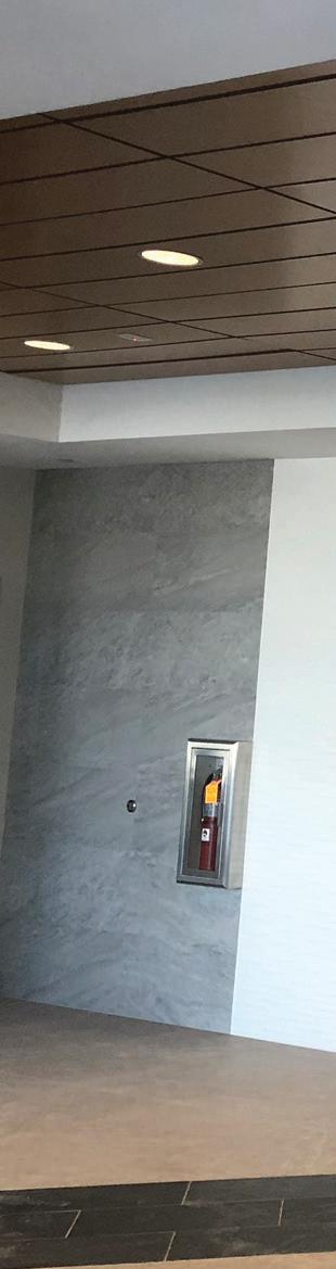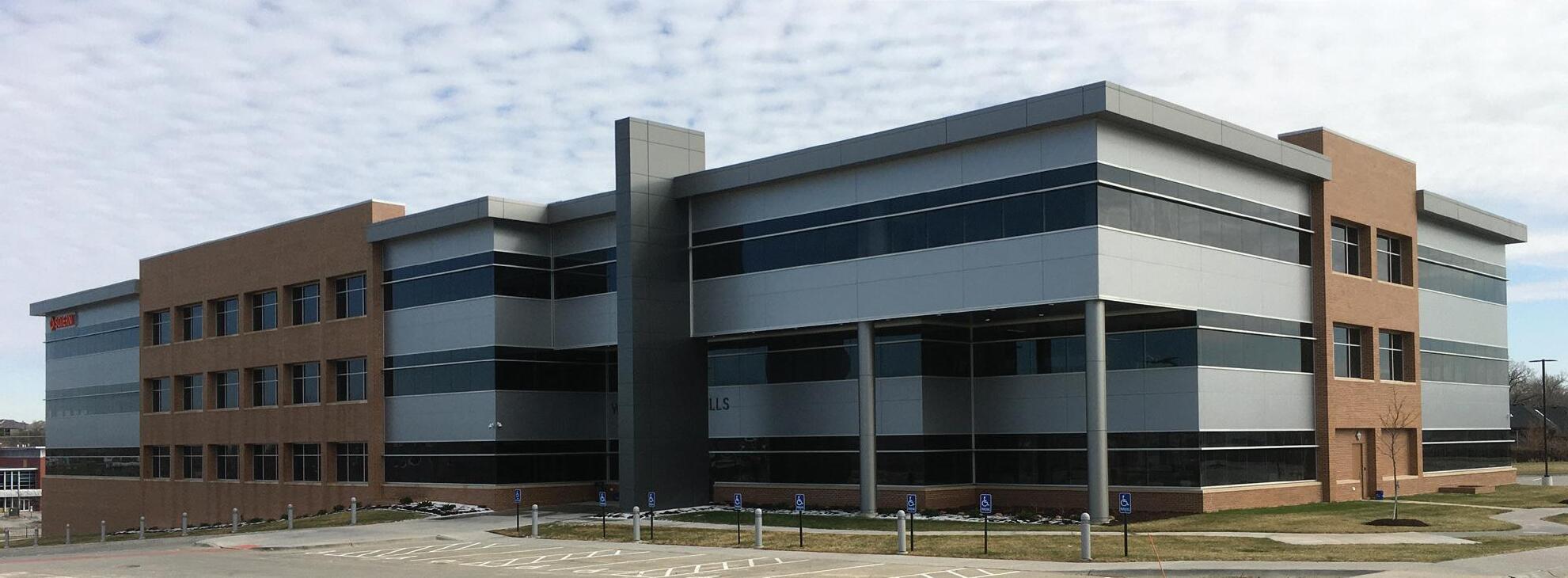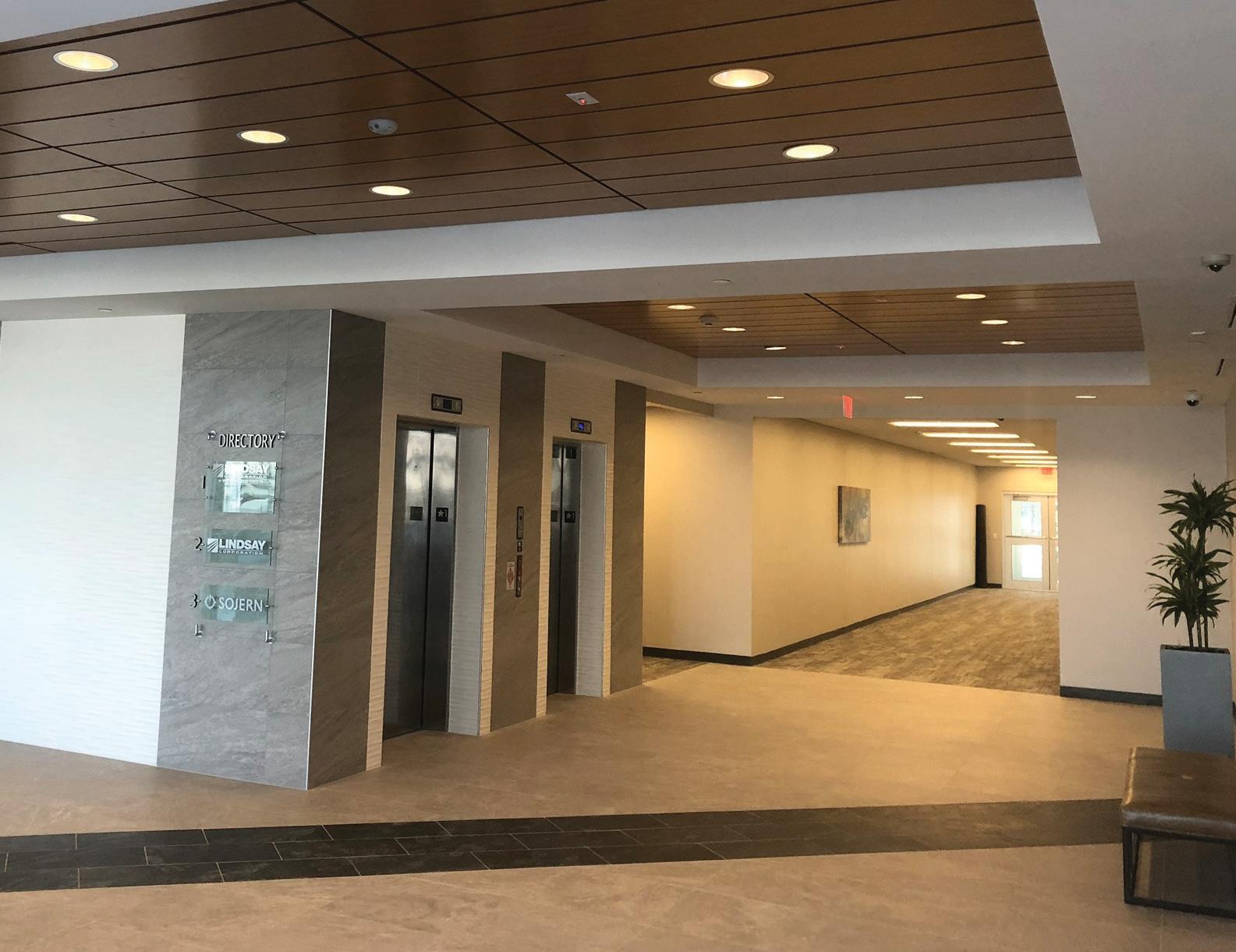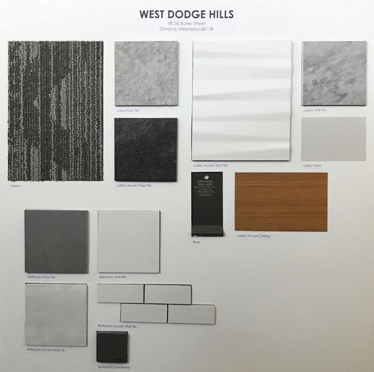 West Dodge Hills is a four level corporate office building shell project with the design of the interior common areas included. The finishes were selected to emphasize high contrast, texture and sharp angles. A dark accent tile stripe draws the eye to the main focal point, the elevator walls. Bright white three-dimensional wall tile with sharp angled lines frame the elevator doors along side a contrasting dark natural stone look tile. Recessed wood ceiling planks add a warm touch to the lobby of this space. The restrooms feature monochromatic white floor to ceiling wall tile with high contrasting black partitions to give the space a high end modern look.