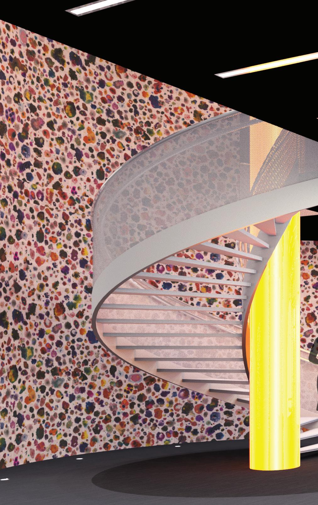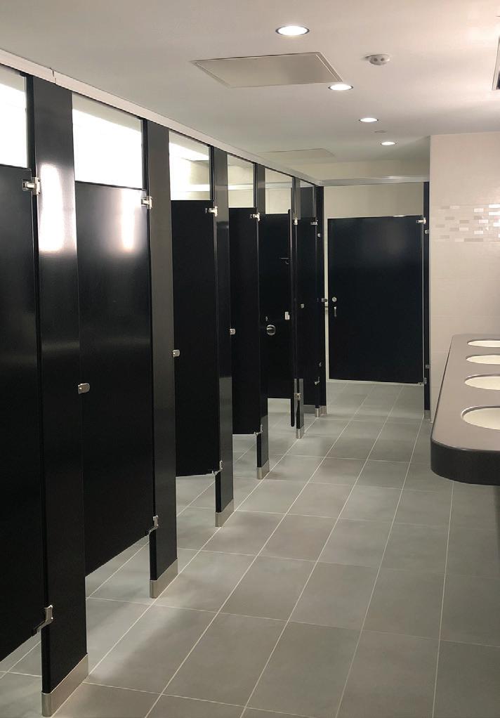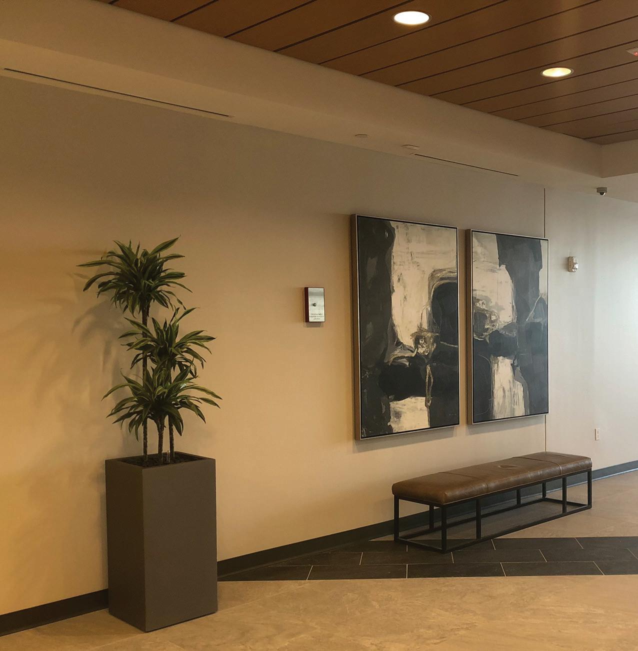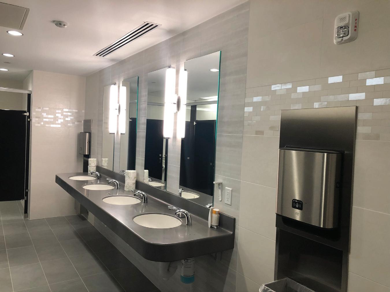 West Dodge Hills is a four level corporate office building shell project with the design of the interior common areas included. The finishes were selected to emphasize high contrast, texture and sharp angles. A dark accent tile stripe draws the eye to the main focal point, the elevator walls. Bright white three-dimensional wall tile with sharp angled lines frame the elevator doors along side a contrasting dark natural stone look tile. Recessed wood ceiling planks add a warm touch to the lobby of this space. The restrooms feature monochromatic white floor to ceiling wall tile with high contrasting black partitions to give the space a high end modern look.