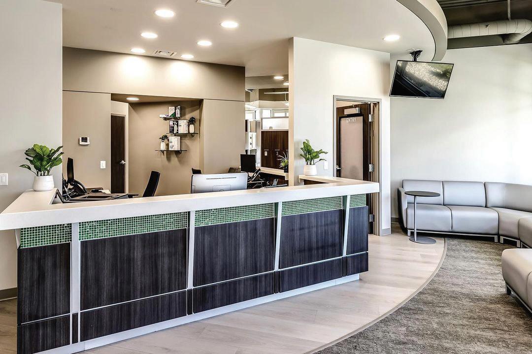 New Image Dentistry desired to add a new location to their expanding business. With this new location, the staff wanted to modernize the building’s interior finishes that they had used on previous projects. In order to achieve this, a new color palette of warm greys was established to give the space a relaxing aesthetic along with accents of their signature green color.