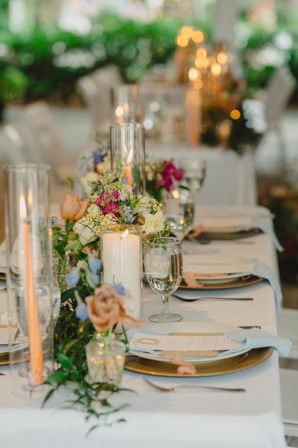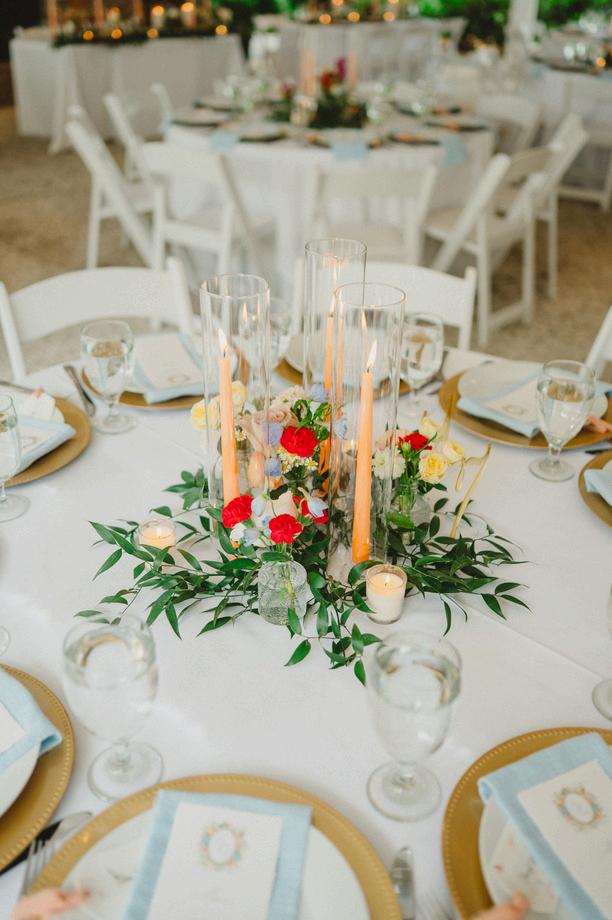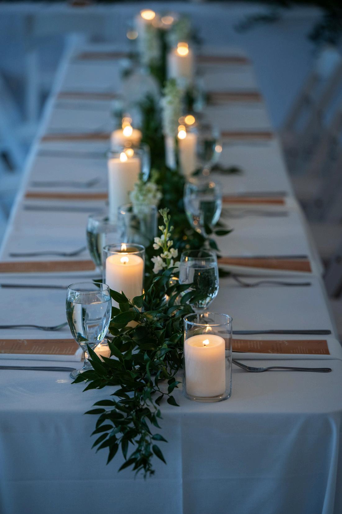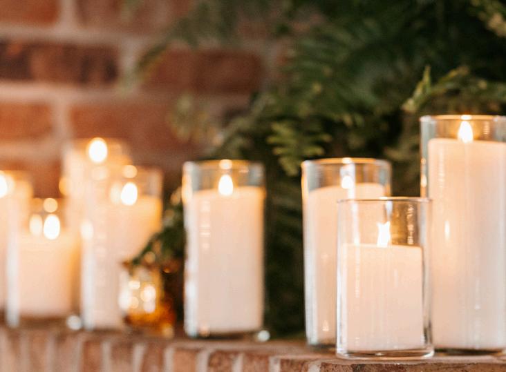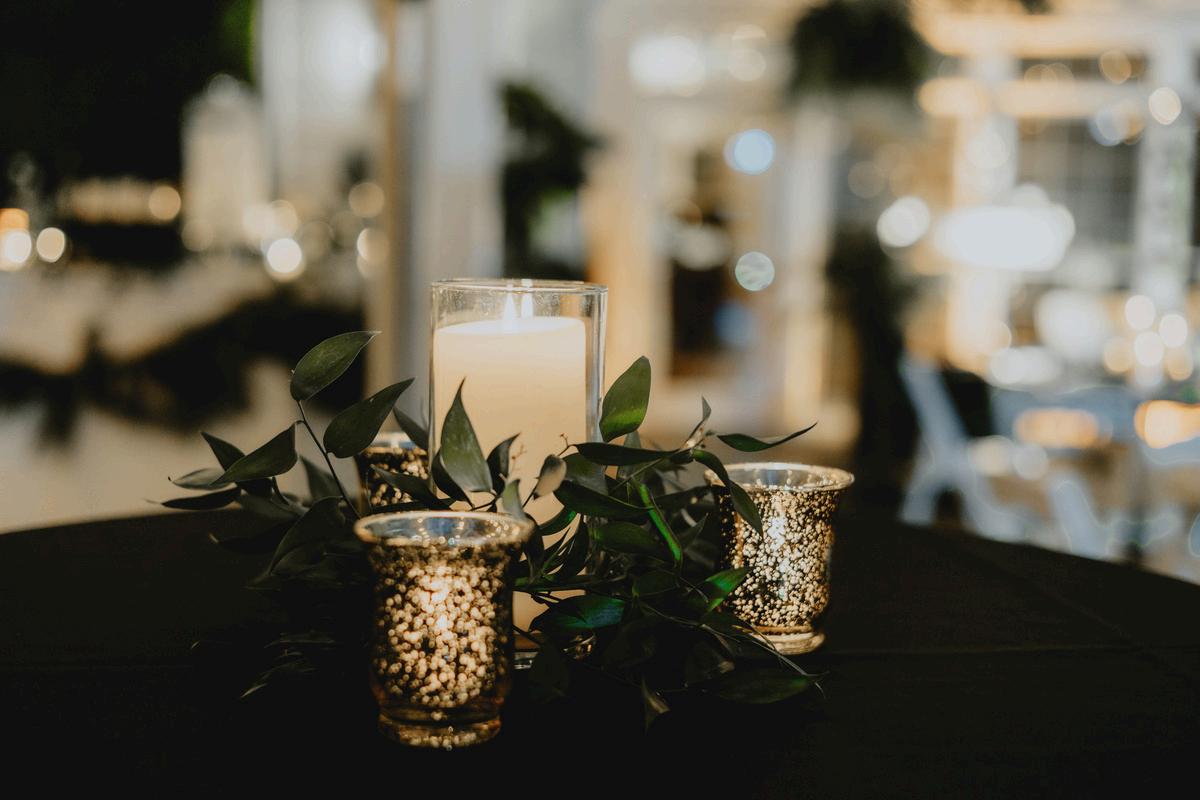 Floating or pillar candles, seasonal greenery, & gold or clear votives on cocktail & coffee tables