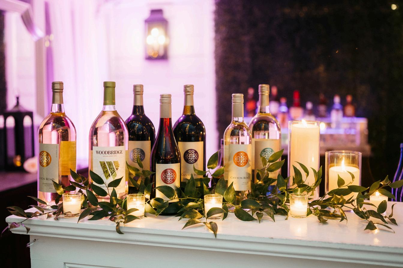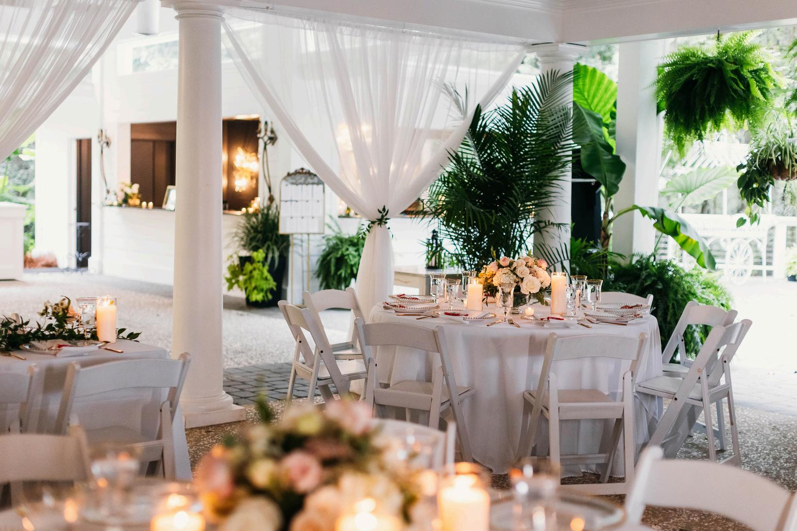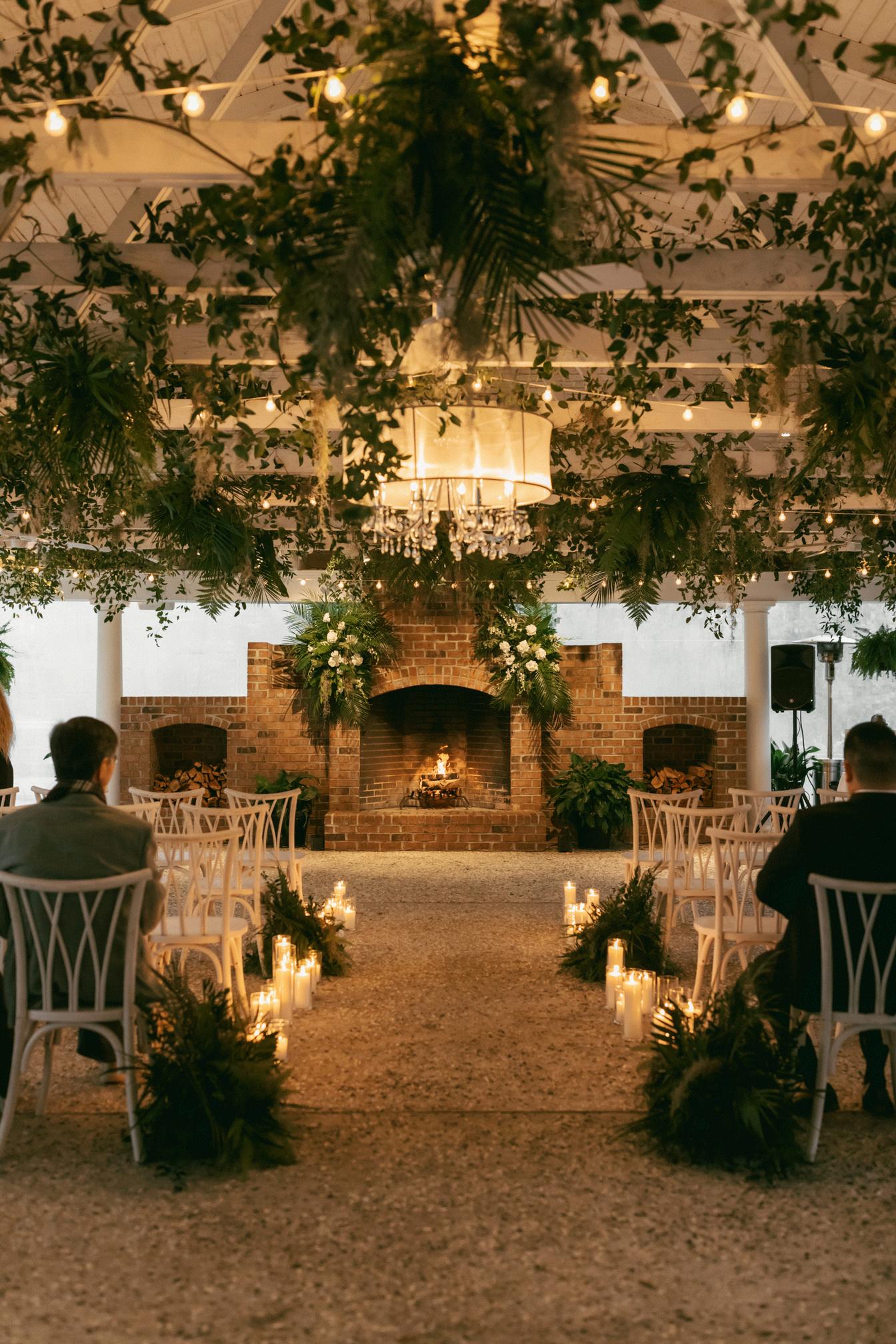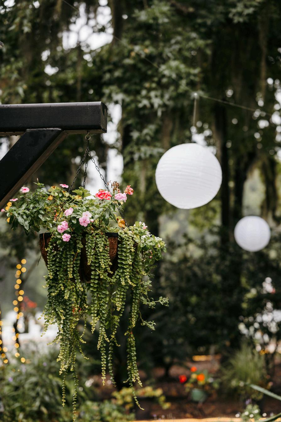 Seasonal greenery, potted plants, black lanterns, and clear votives to accent throughout the space