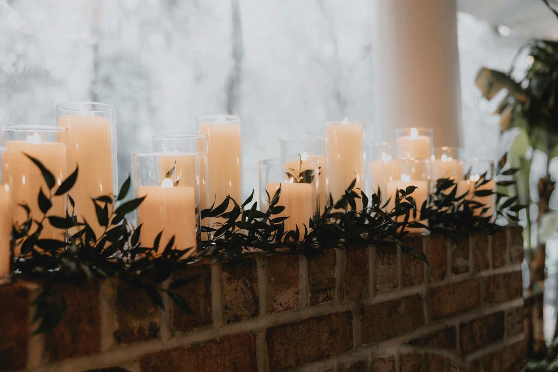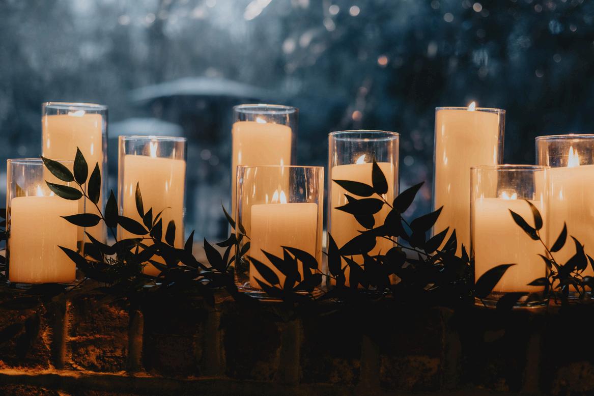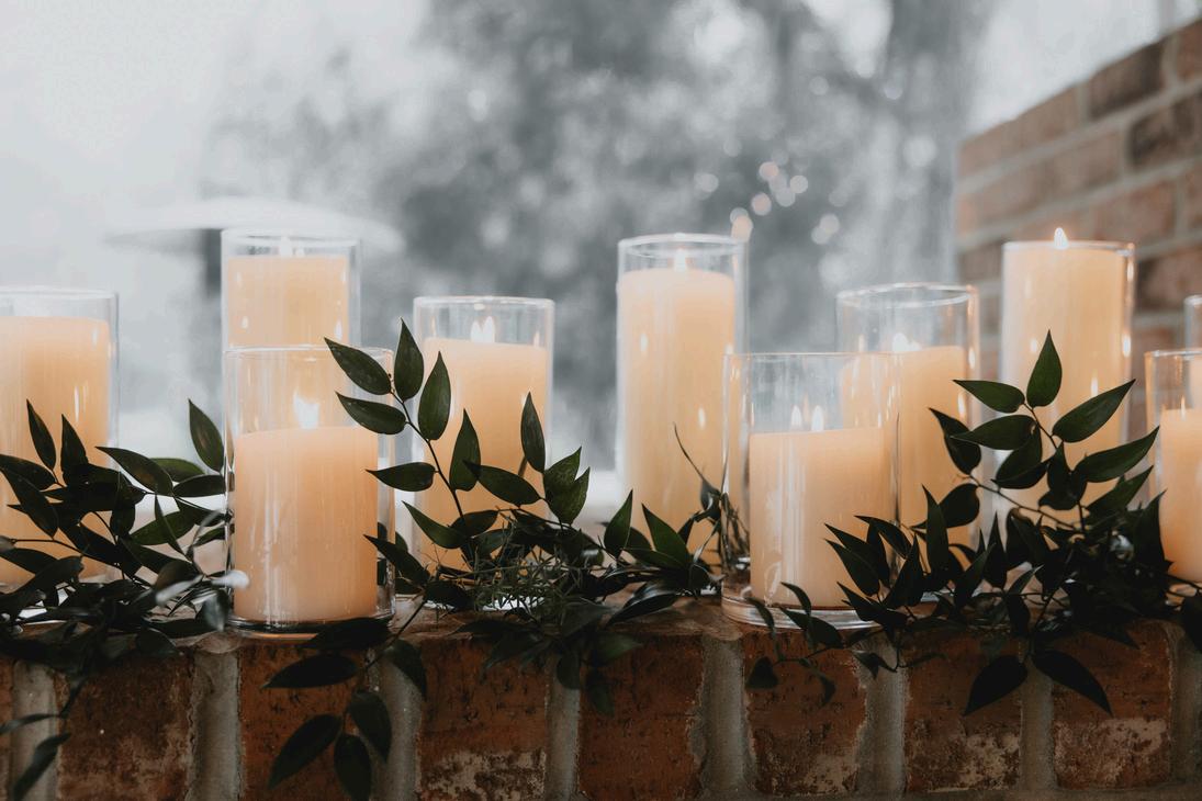 Pillar candles, seasonal greenery, & gold or clear votive candles