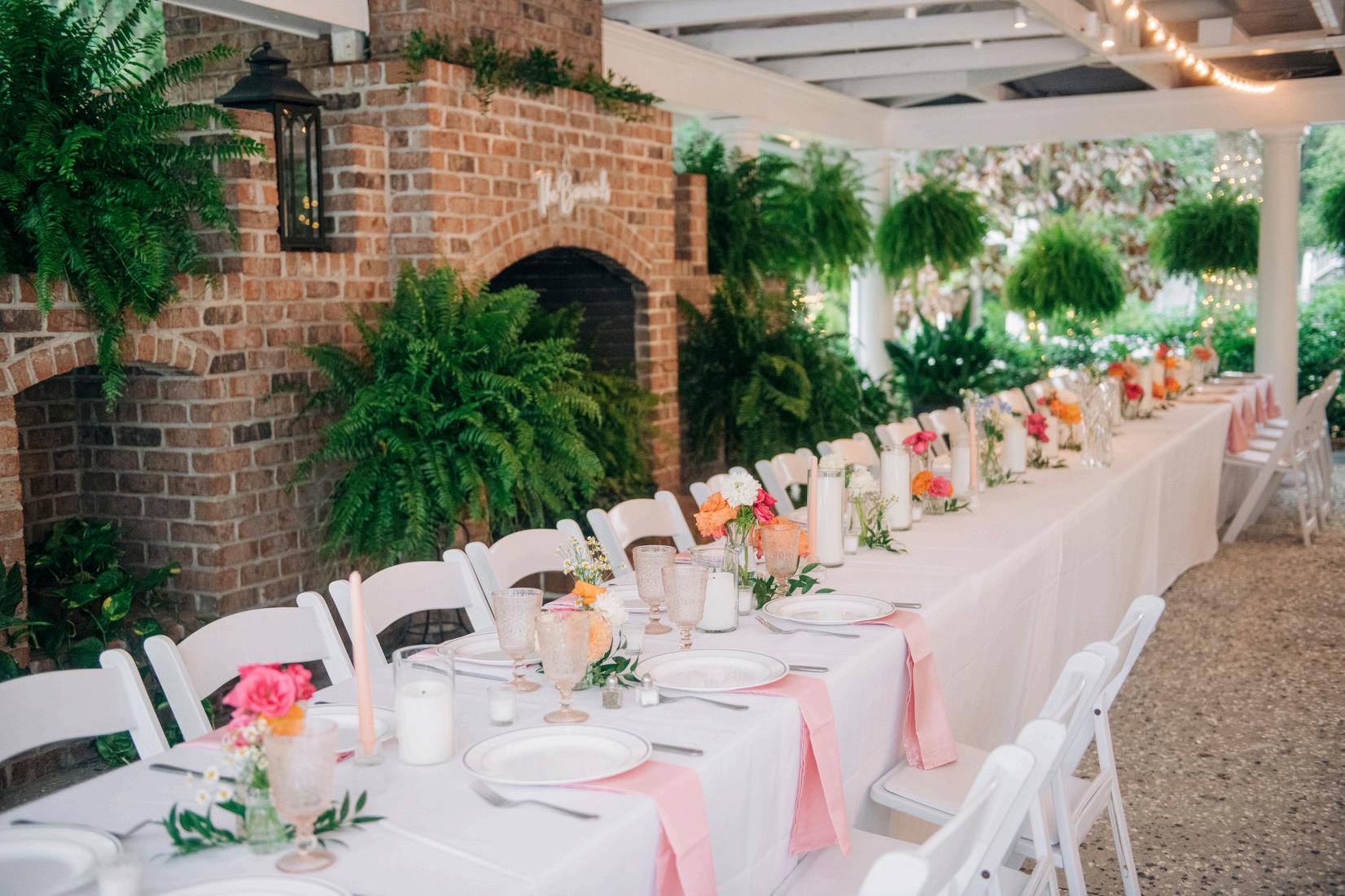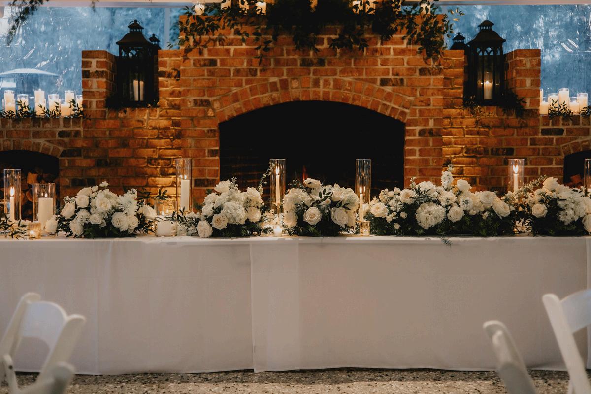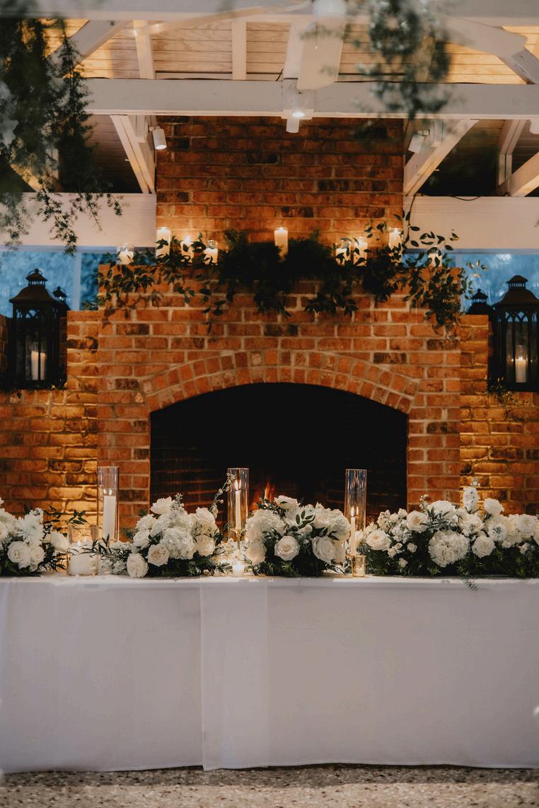 Draping placed in front of the large brick fireplace in the open-air pavilion