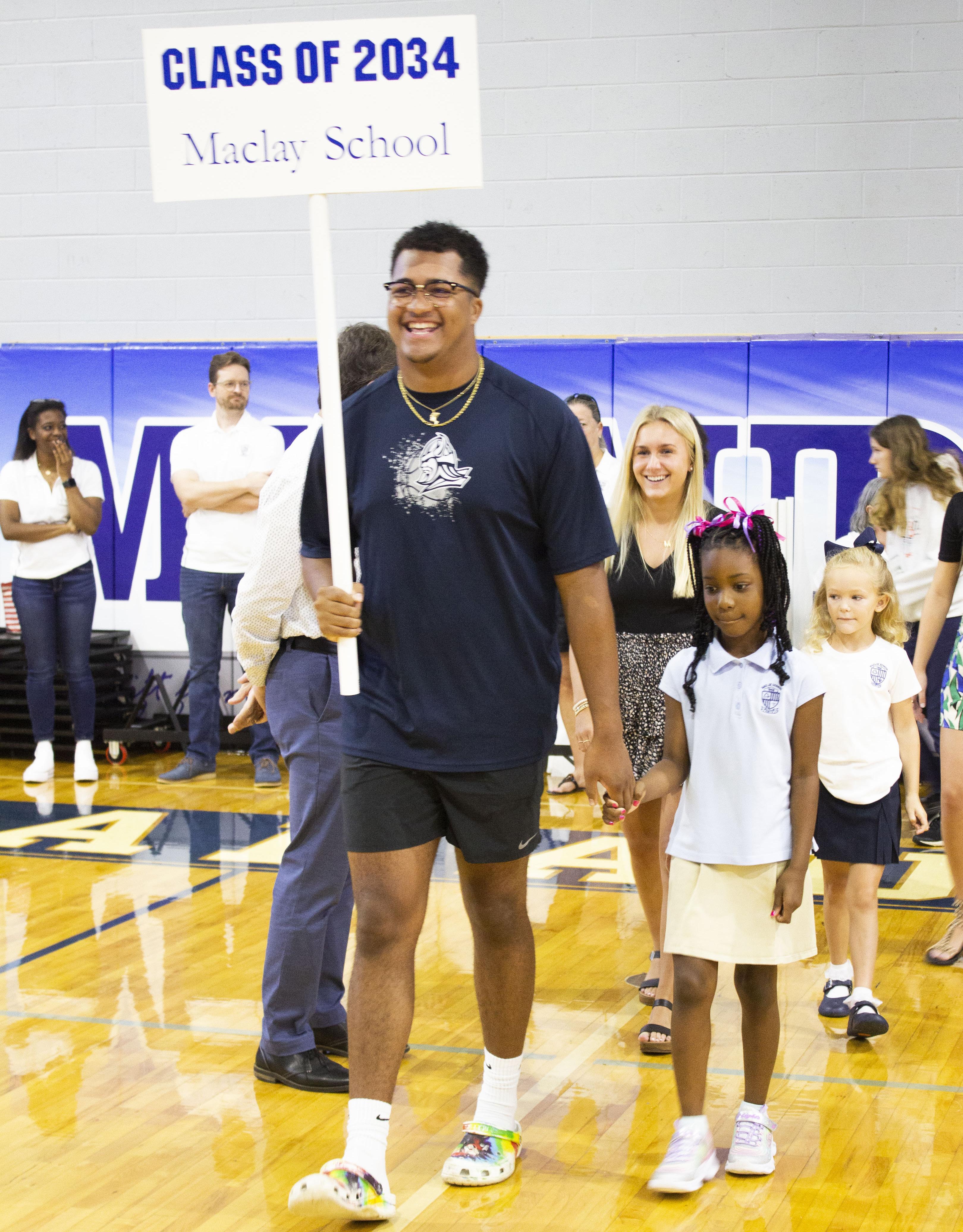 ALL SMILES. Senior Evan Brown leads the procession of seniors accompanied by their first and second grade buddies at Maclay’s annual convocation. This marks the first Convocation back together since 2019, and is the official welcome to the new year.