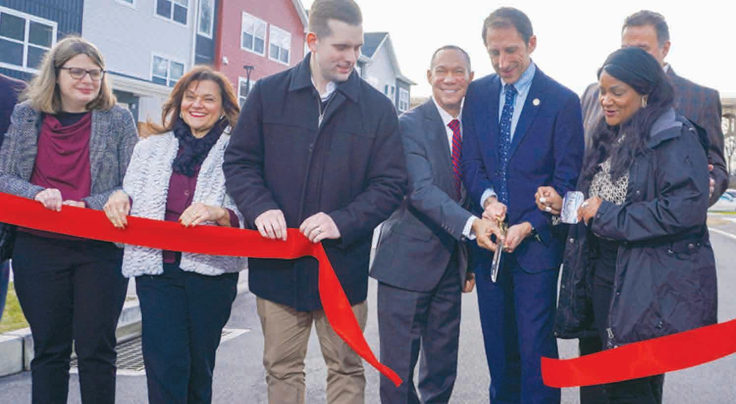 Replacing the outdated 1970s-era complex formerly known as Little Lehigh, Bridgeside Estates is owned by the Allentown Housing Authority (AHA) and was developed by Pennrose, LLC. Celebrating at the ribboncutting for Phase 1 of the redeveloped complex are: Jessica Perry, Pennsylvania Housing Finance Agency; Fadia Halma, Regional Director, Pennsylvania Department of Community & Economic Development; Joshua Siegel, State Representative; Julio A. Guridy, Executive Director, AHA; Matthew Tuerk, Mayor, City of Allentown; Cynthia Mota, Council President, City of Allentown; and Fred Bañuelos, Board of Commissioners, AHA.