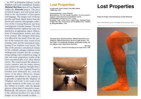 A multi-media, Sound, Image & Text public artwork, Š MMcClean 1997 Commissioned by: London Siteworks Sponsored by: The Paul Hamyln Foundation, The Arts Council of England, London Arts Board and Southwark Council. First Exhibited: October-Dec 1997, London. Reviewed: South London Press, Capital Radio, Southwark News, In-Sight, Nov 1997, Sound Sense and Sensibilities,Circa- reviewed by Shirley MacWilliam, 1998