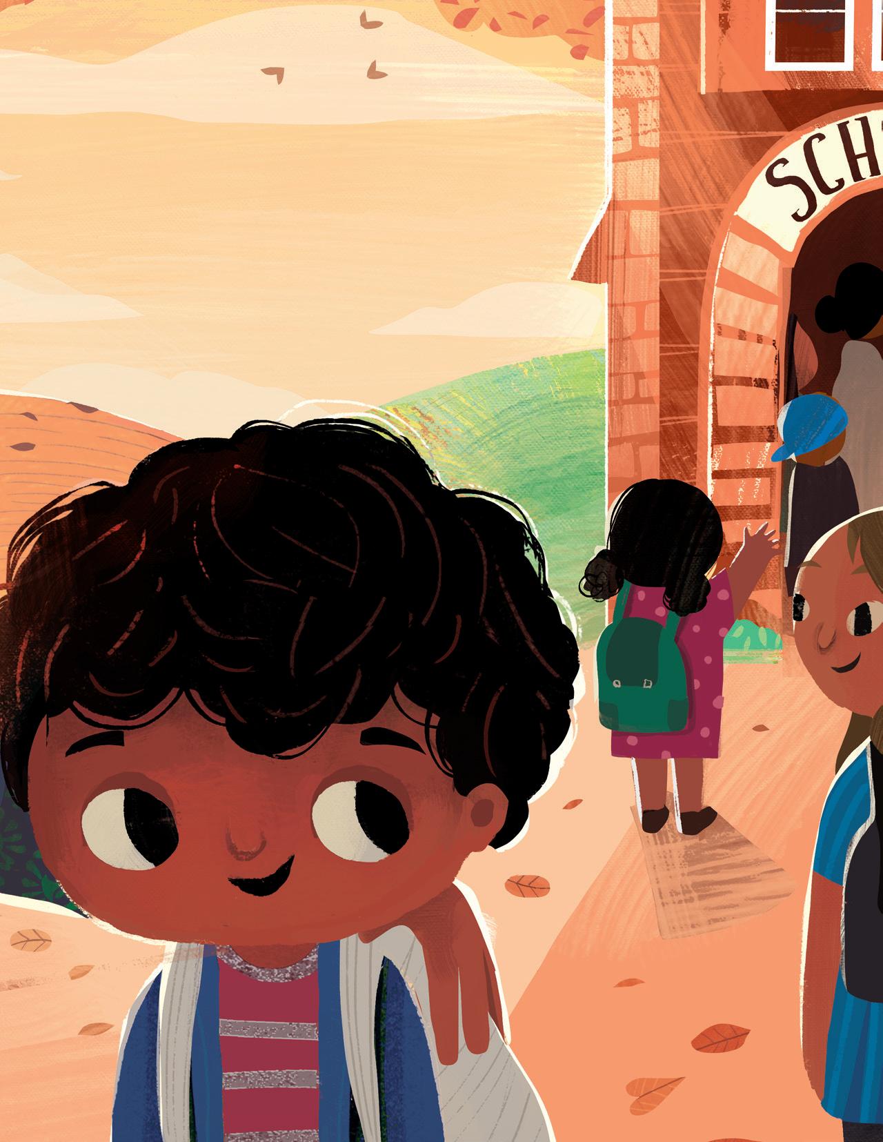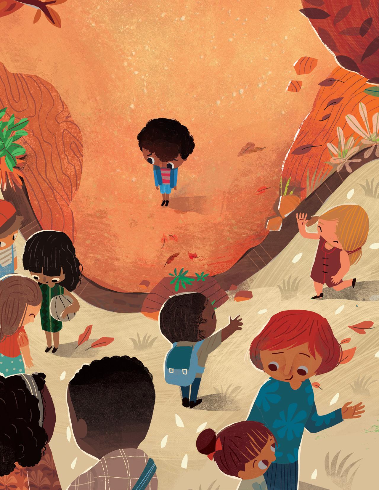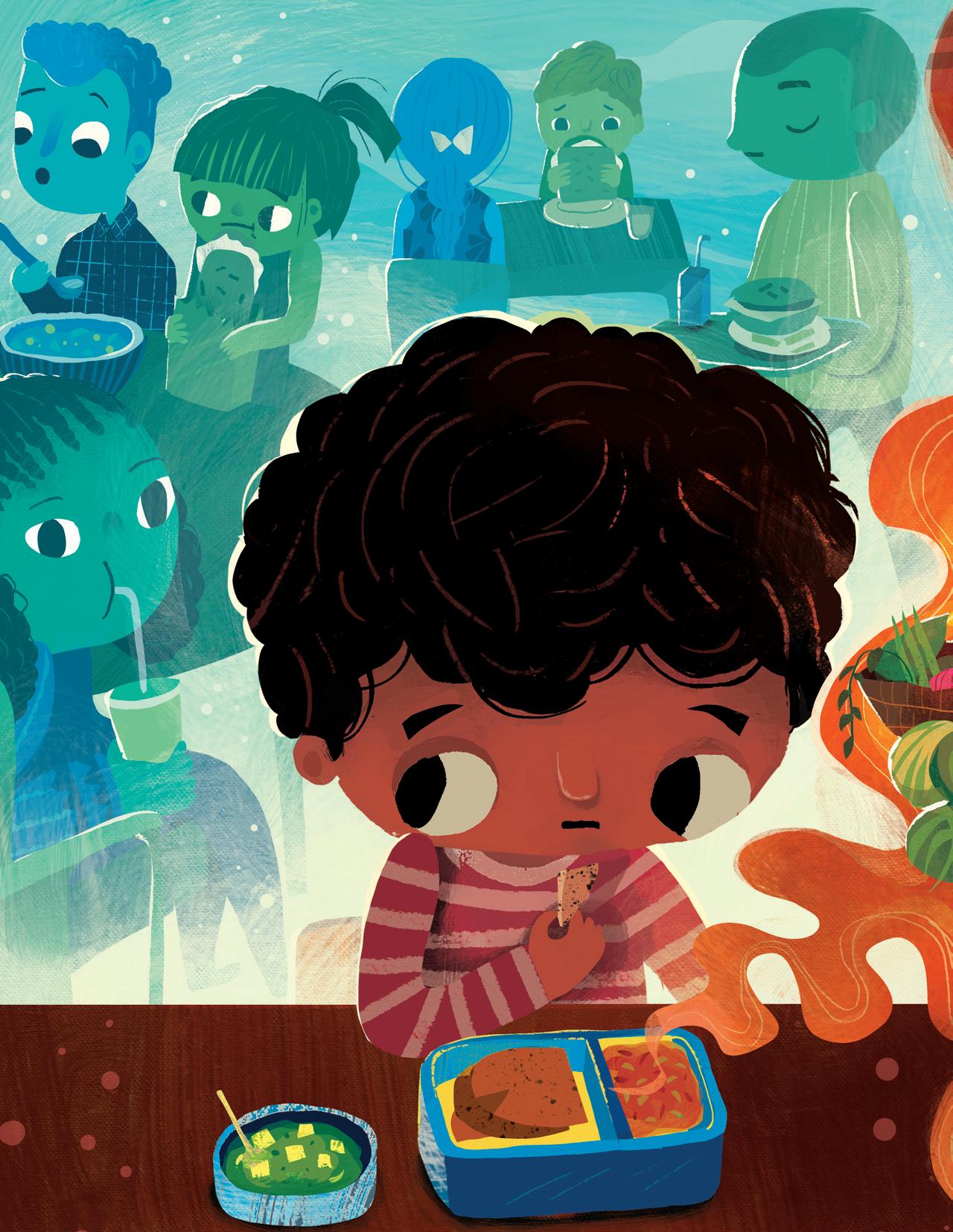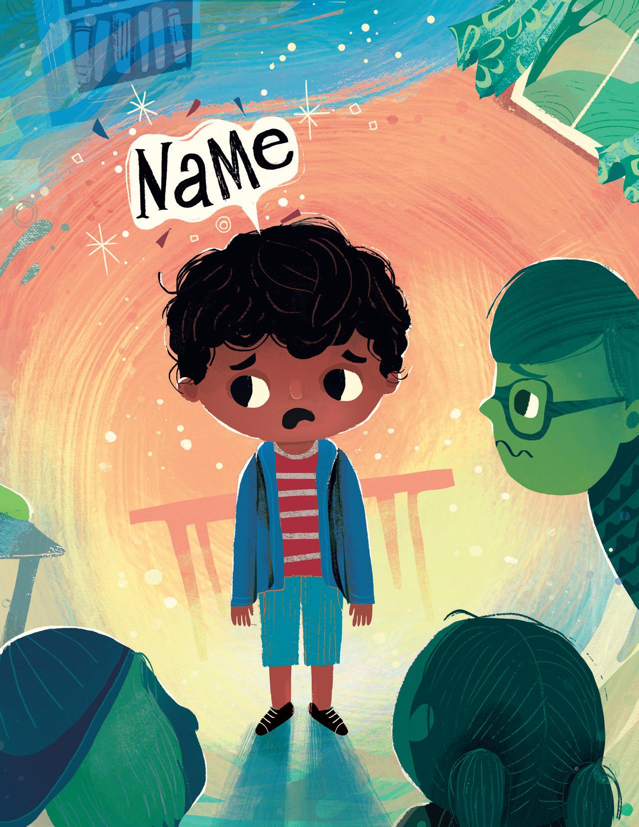 Supriya’s rhythmic and lyrical storytelling involved mirroring and revisiting scenes from the first part (the boy feeling embarrassed or frustrated) in the second part (the boy embracing his name), and I tried to do the same with my illustrations. I used recurring but modified imagery: mirroring spreads one after another, and turning cold, uncomfortable scenes in blue and green into warm and friendly moments in shades of orange and brown and yellow as his perspective changed. The inspiration for the cover came from a Maya Angelou quote that I love: “I come as one, but I stand as ten thousand.” Although the boy stands alone, he isn’t lonely. He brings with him his foremothers and forefathers, his friends and family, and feels strong and supported.